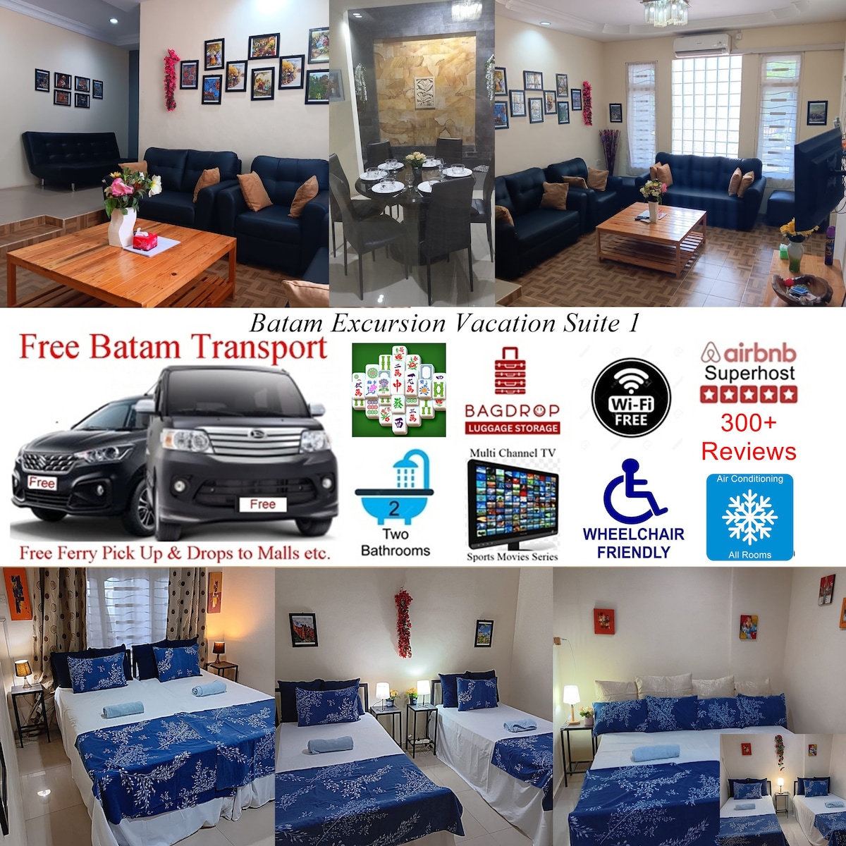 Batam Excursion Vacation Suite 1 - Airbnb Superhost (300+ 5 star reviews) Presented clean with fresh linen & towels & Free Transport Air-Conditioned - High speed WiFi - Multi Channel TV - 2 Bathrooms - Fully Equipped Kitchen - Lounge & Separate Dining Area. Wheelchair friendly Click on the photo gallery & scroll to see all rooms & further details Strategically located in quiet complex near malls, spas, food courts & restaurants More than 6 pax? Contact us for details about other apartments.