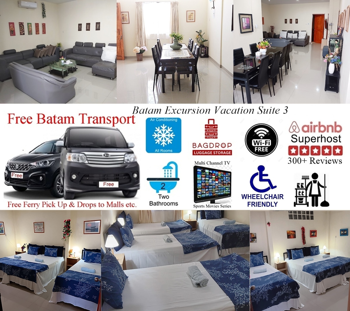 Batam Excursion Vacation Suite 3 Free transport options Superhost (250+ 5 star reviews) Air-Conditioned - High speed WiFi - Multi Channel TV - 2 Bathrooms Presented clean with fresh sheets & towels. BBQ facilities Wheelchair Access Strategically located in quiet complex near malls, spas food courts & retaurants. More than 10pax? Contact us for details about other apartments.