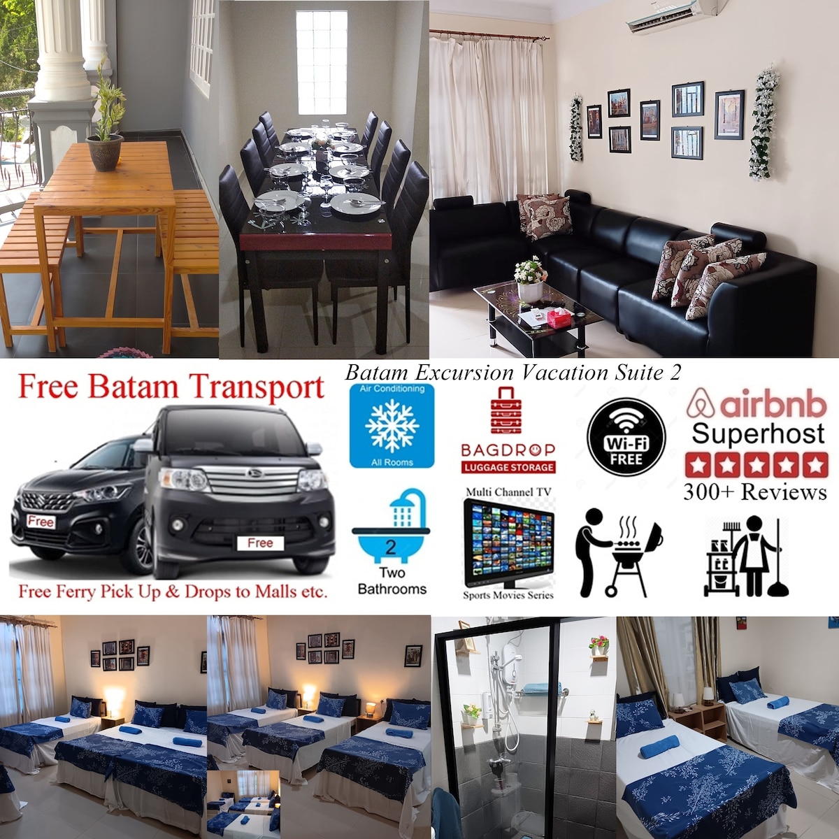 Batam Excursion Vacation Suite 2 Free transport options Superhost (250+ 5 star reviews) Air-Conditioned - High speed WiFi - Multi Channel TV - 2 Bathrooms Presented clean with fresh sheets & towels. BBQ facilities Strategically located in quiet complex near malls, spas food courts & retaurants. More than 9pax? Contact us for details about other apartments.