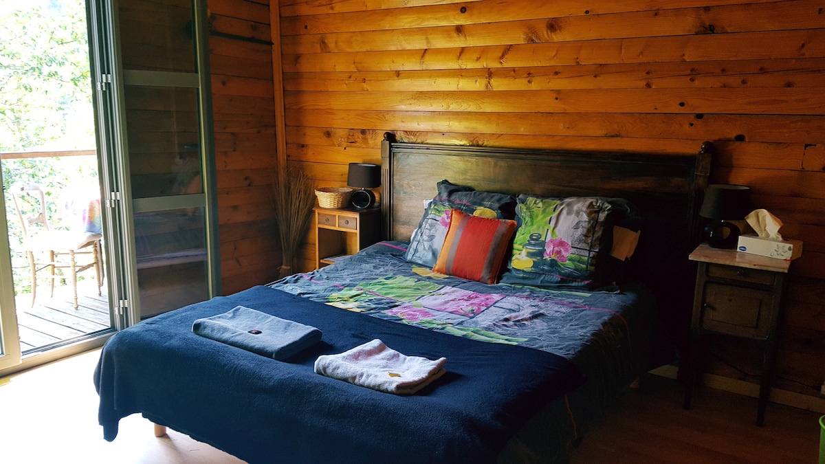 Habitación MATRIMONIO I para 2 personas, una cama grande, llaves privadas de habitación y entrada, desayuno buffet de la tierra incluido. Rural Hostel dos Lucas ubicado en Orós Bajo, Biescas, a las puertas del Valle de Tena, en el Pirineo Aragonés, a 5 minutos de pozas, ríos y baños naturales, junto a la famosa cascada dos Lucas.