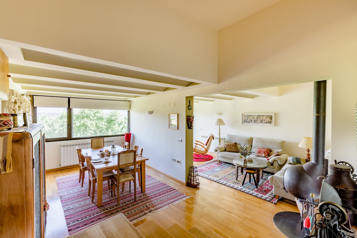 No voldràs marxar d’aquest espai únic i acollidor, on et sentiràs com a casa. Es lloga una habitació per a dues persones amb bany privat en una casa de dues plantes. Gaudeix de la llibertat de moure’t per Cal Paleta sense cap restricció. Comparteix el menjador i la cuina americana, equipada amb forn, on podràs cuinar amb tota tranquil·litat. Cada matí, prepara l’esmorzar i gaudeix-lo a la terrassa amb vistes espectaculars a la Serra del Cadí.