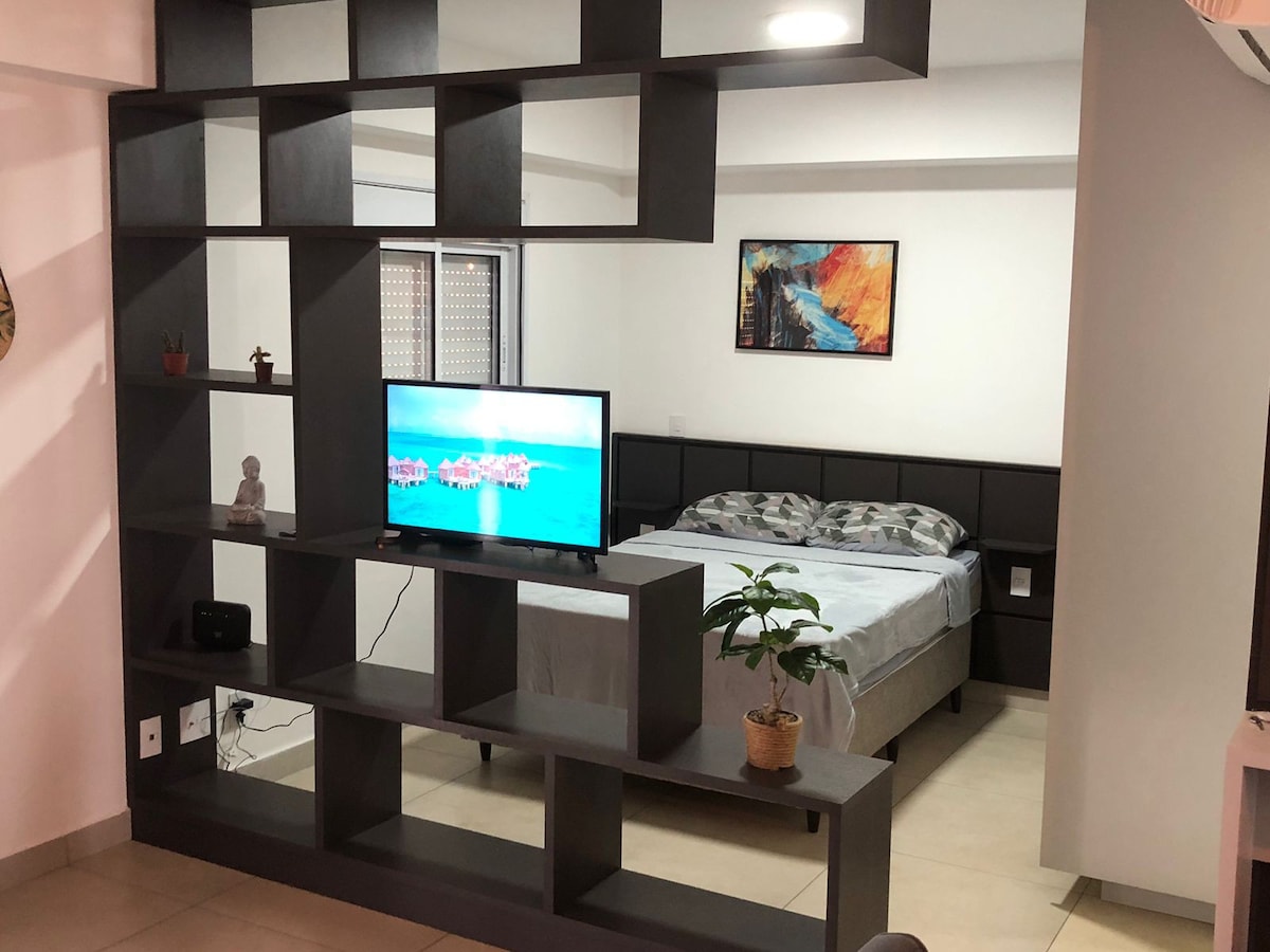 O ap é um STUDIO (pequeno)bonito e aconchegante mobiliado com vários itens pra vc ficar vários dias,o colchão é de espuma e bem firme, a TV contém vários canais esportivos, filmes etc. EU mesmo faço a limpeza do AP (Dentro do Prédio possui um mercadinho com vários intens de bebida e comida para facilitar a vida do hóspede)o prédio é calmo, tranquilo e Fácil acesso! check in pode ser feito na portaria ou comigo, prédio perto de 2 shoppings,bares,Fatesa,Unip, pizzaria, posto de gasolina..