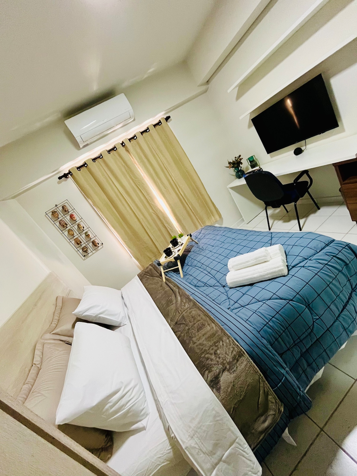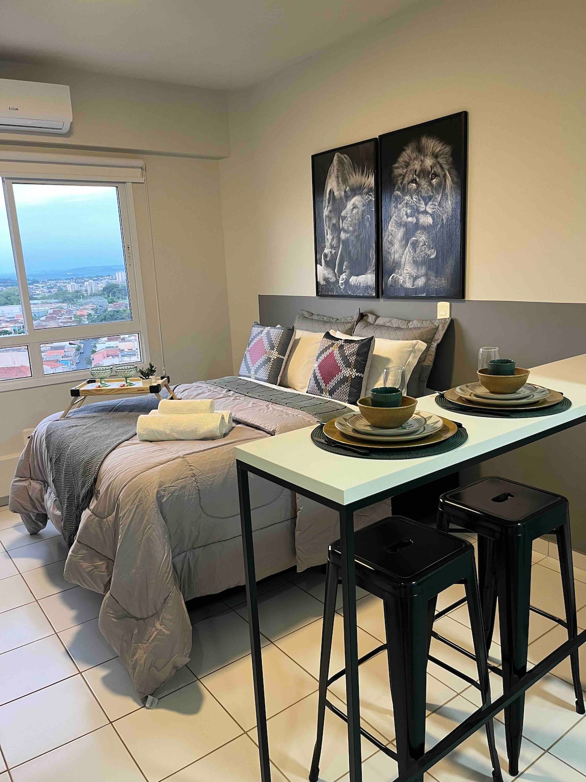 Studio novo completamente equipado e decorado para uma hospedagem perfeita! Cama confortável, cozinha completa e banheiro. Condomínio diferenciado com piscina, academia e muito mais. Ótima localização e atendimento diferenciado durante toda a sua estadia.