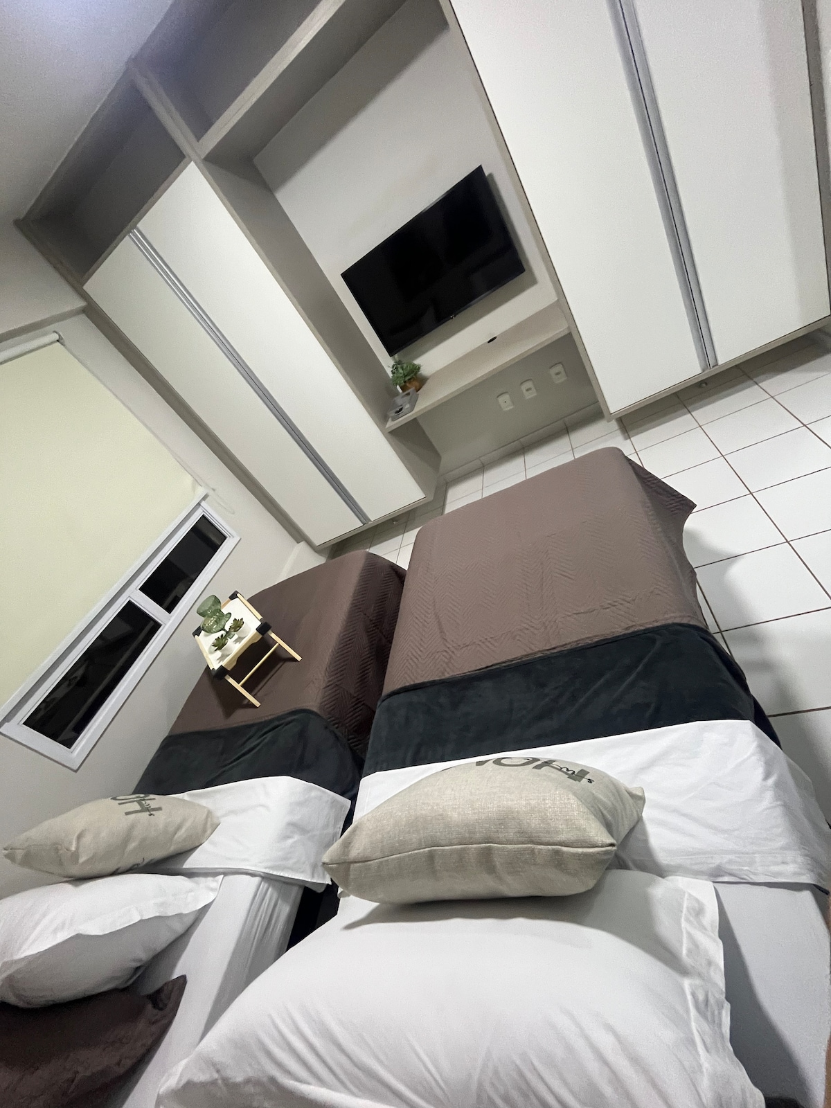 "Super aconchegante, ambiente decorado e mobiliado, ambientes espaçosos e arejados, apartamento com sacada, cortinas com blackout. Praticidade com serviços Day Use, 01 vaga de garagem com manobrista, para pequenas ou longas estadias. Comodidade e segurança para que sinta-se em casa." “Troca de banho e cama disponível a um custo de R$4,60 por peça pagos na recepção. Danos serão cobrados” ==Imovel para uso exclusivo residencial nao podendo ser utilizado para fins comerciais de nenhum tipo==