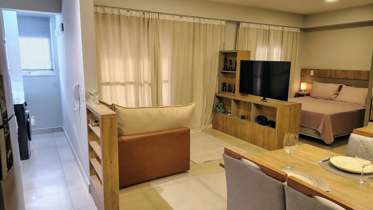 ✨ Seu refúgio de conforto e sofisticação! ✨ Hospede-se neste apartamento luxuoso e completo, perfeito para quem busca comodidade e bem-estar. ✔️ Ambiente moderno: cozinha equipada, sala aconchegante, quarto confortável e banheiro elegante. ✔️ Conectividade e lazer: Wi-Fi grátis, Netflix (use sua conta), piscina aquecida, academia, sauna e salão de jogos. ✔️ Conveniência: mesa para refeições, 1 vaga coberta e roupas de cama e banho. ✔️ Check in rápido