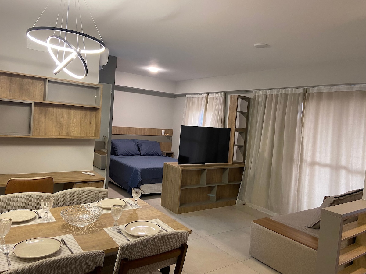 O Studio oferece uma experiência aconchegante e uma localização privilegiada. Com acesso fácil para a Agrishow e fica a apenas 3 minutos do Ribeirão Shopping. Possui um 1 cama Queen e uma bicama, além de uma TV de 55' com acesso ao Netflix com login do hóspede. Conta com 1 banheiro, sala, cozinha, área de serviço equipadas e ar-condicionado, além de 1 vaga de estacionamento. O hall de entrada é lindo e a área de lazer completa inclui sala de jogos, sala de relaxamento/sauna e piscina.