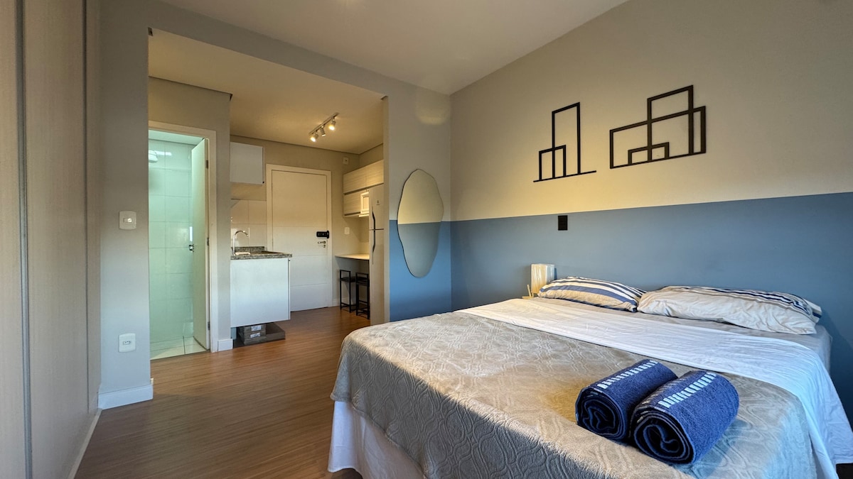 Este Studio é muito especial e diferenciado. Foi muito bem arquitetado para receber bem os hóspedes. O studio possui uma divisória formando 2 ambientes totalmente independentes, o quarto e a sala. Cada comodo possui sua própria TV e ar condicionado. Excelente para uma ótima estadia para dois ou mais hóspedes. A cozinha conta com todos os itens básicos, fogão, microondas e forno. Possui mesa com cadeiras para possível trabalho Home Office e boa internet. Possui uma vaga de garagem coberta.