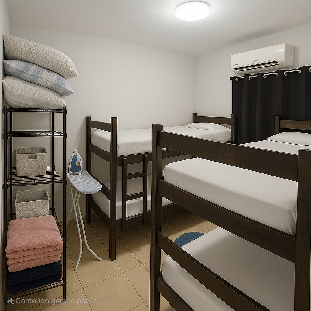 O apartamento foi montado pensando na praticidade do dia a dia. Todo equipado e decorado para facilitar sua estadia. No quarto temos a cama casal, armário guarda roupas, janela com fechamento Blackout e ar condicionado. Sala com balcão e uma pequena mesa. Uma bi-cama com colchões solteiro. Cortina blackout. Ar condicionado. Cozinha completa. Pratos talheres canecas copos panelas cafeteira. Café como cortesia. Máquina de lavar roupas.