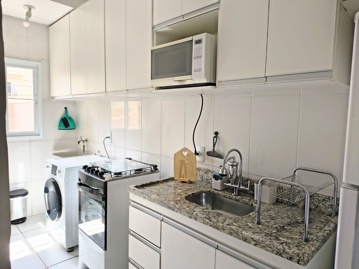 Apartamento com 2 quartos com cama de casal, sendo 1 suíte, 2 banheiros, com roupa de banho e cama disponíveis. Ar condicionado em ambos os quartos Cozinha toda equipada com utensílios, airfryer, chapa, liquidificador Lavanderia equipada com maquina de lavar Sala com TV smart e sofá retrátil Mesa de jantar com 4 lugares 2 varandas Acesso no prédio a marktplace 24 horas Localizado na Av. principal, próximo ao Ribeirão shopping e várias lojas, farmácias e restaurantes.