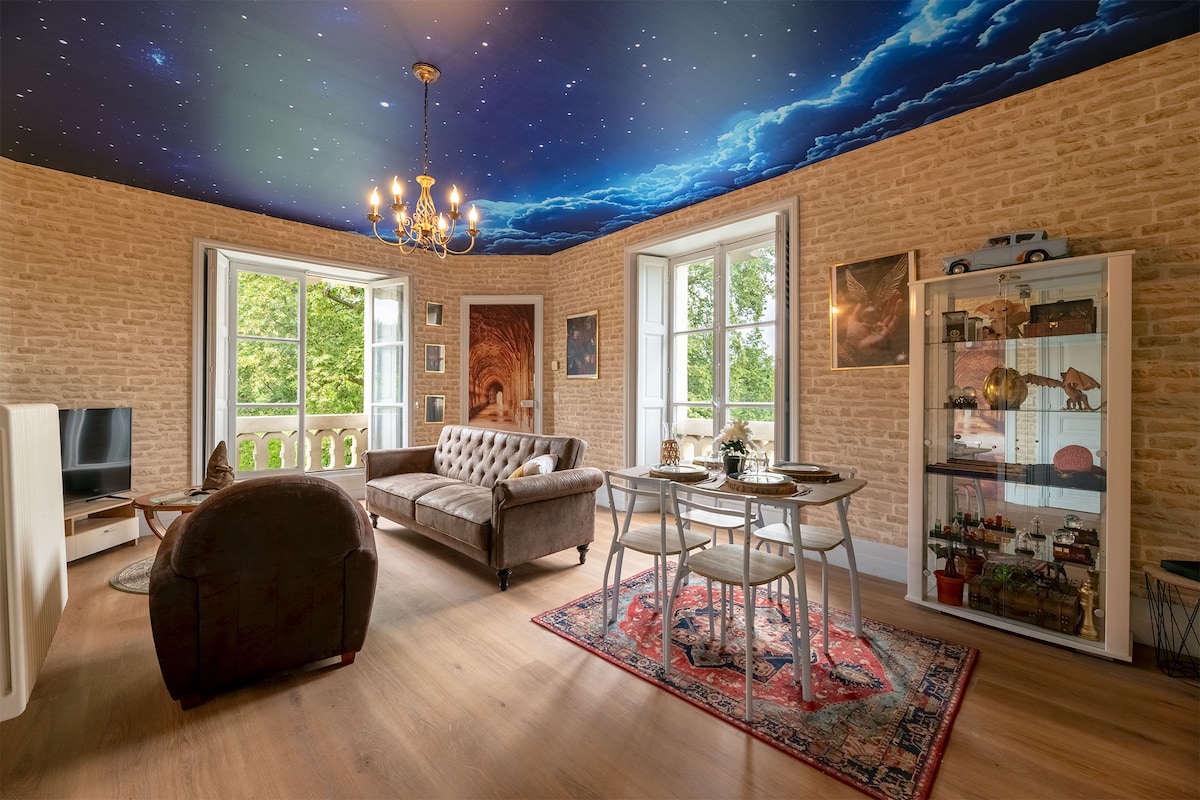 Logement atypique classé 5 ⭐️⭐️⭐️⭐️⭐️, calme et élégant, situé en plein centre de Mussidan. C'est un grand loft de 80 m² au sol, sous combles (53 m² loi carrez). Vous serez séduit par le charme des combles aménagés. La chambre est ouverte sur le logement. - 4 personnes adultes +1 bébé (1 lit double, un canapé-lit Rapido et un lit parapluie) - Cuisine équipée - TV - Fibre - Draps, serviettes et linge de maison - Parking gratuit - Gare SNCF à 850 mètres - À moins de 3 km de l'A89