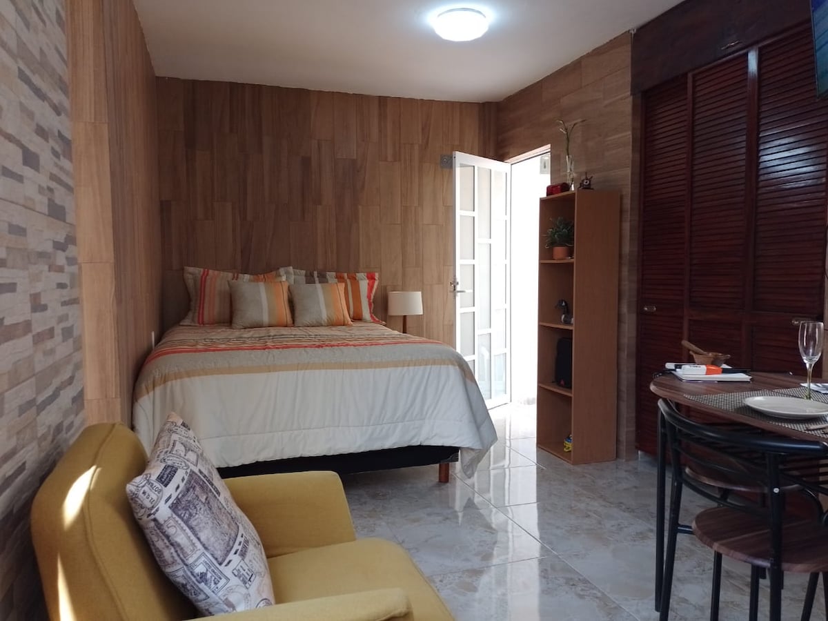 *Dulce Suite*, Relájate y disfruta de las noches en esta suite tranquila y acogedora, Iluminación y ventilación.Con entrada independiente, privacidad absoluta, ubicada en planta baja. Se te asignará una llave(te apoyaremos en cualquier momento). Cuenta con baño privado, área para dormir con cama matrimonial, cocina con todo lo necesario para tu estadía, barra comedor, sillón, escritorio con sillas, wifi, T.V. Smart H.D. de 43", Netflix. Café,té,mermelada,pan tost. incluido con tu reservación.