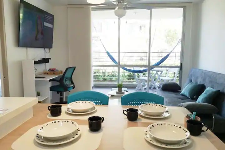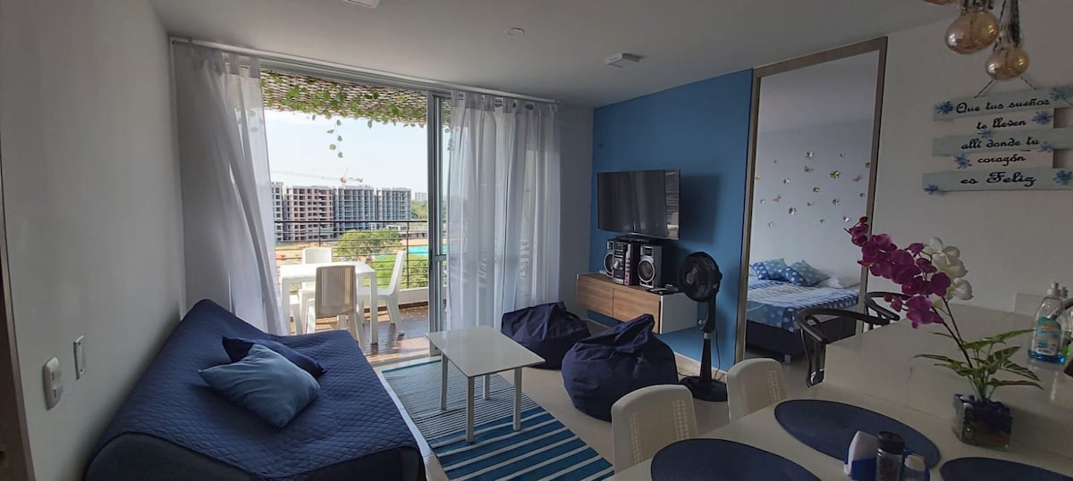 Magnifico apartamento con espectacular vista, completamente dotado. Dos habitaciones cada una con aire acondicionado. Wifi, Smart TV en sala y habitaciónes con las aplicaciones de Streaming (Ingresar con sus propias cuentas debido a las políticas de las plataformas), BBQ gas natural en balcón, hamaca. Conjunto con jacuzzi, piscinas, tenis de mesa, billar pool, futbolín, gimnasio. Complejo deportivo con canchas de tenis, futbol 5, cancha múltiple, parque infantil e iglesias