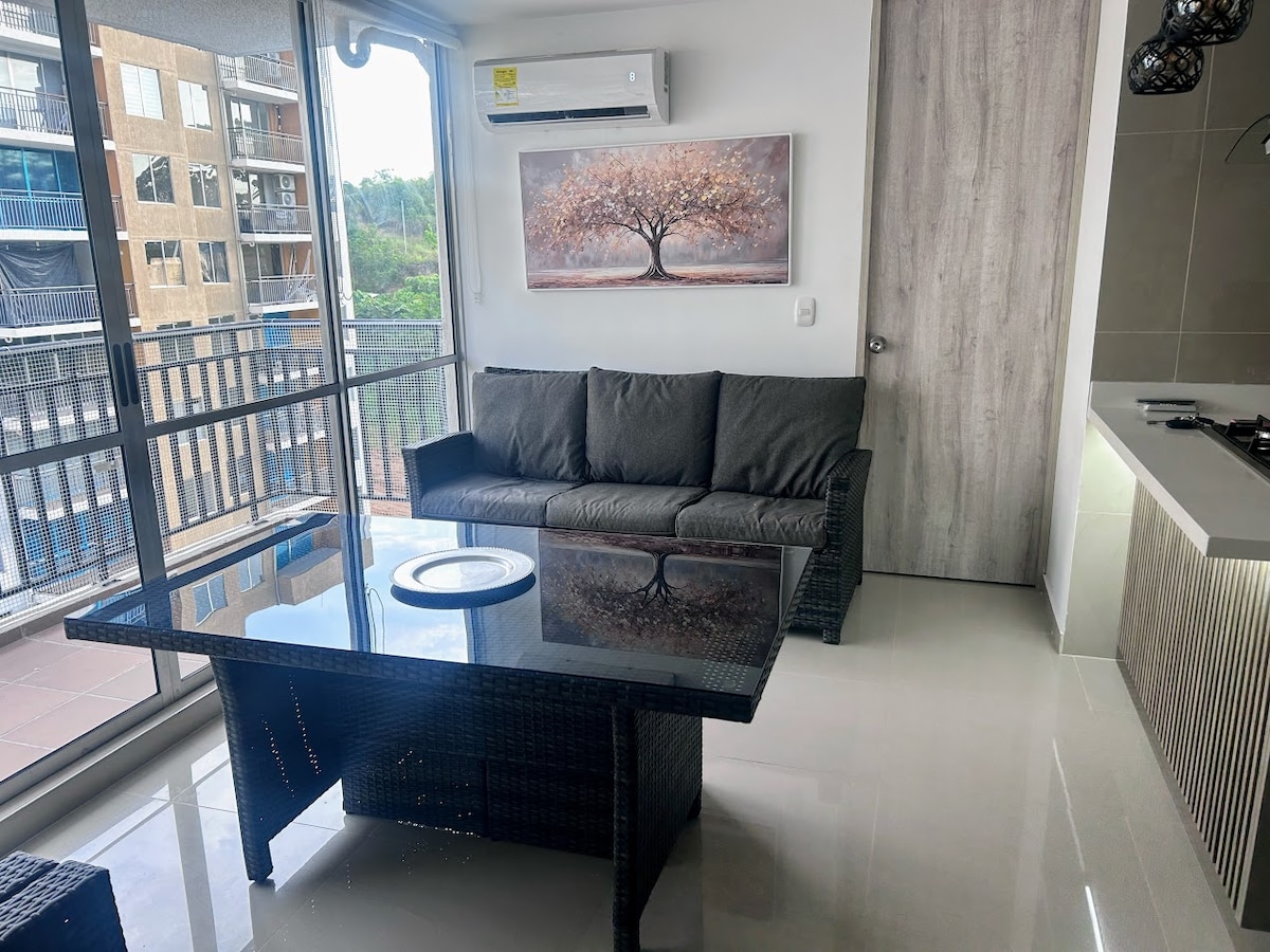 Relájate en este hermoso apartamento, con balcón y una hermosa vista, cocina estilo americano, cuenta con 3 aires acondicionados (habitación principal , habitacion auxiliar y sala), vigilancia 24h, parqueadero propio, clima fresco, habitaciones con closet, 2 baños, 1 piscina para adultos y 1 para niños, wifi, zonas verdes y una recepción con lobby, de fácil acceso y transporte, cerca a CAFAM, a 7 min de terminal de transporte y a 5 min del centro, ideal para el descanso.