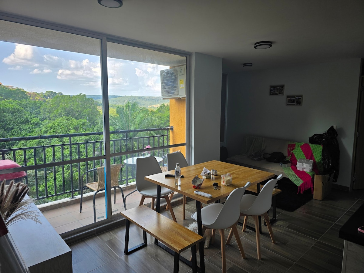 Relájate y descansa en este hermoso apartamento, con balcón y una hermosa vista, cocina estilo americano, aire acondicionado en la habitación principal, vigilancia 24h, parqueadero propio, un lugar rodeado de naturaleza y aire limpio, clima cálido, habitaciones con closet, baño privado, 2 piscinas para adultos y 2 para Niño, internet, zonas verdes y una recepción con lobby, de fácil acceso y transporte, cerca al terminal de transportes y a 5 min del centro, ideal para el descanso tranquilo.