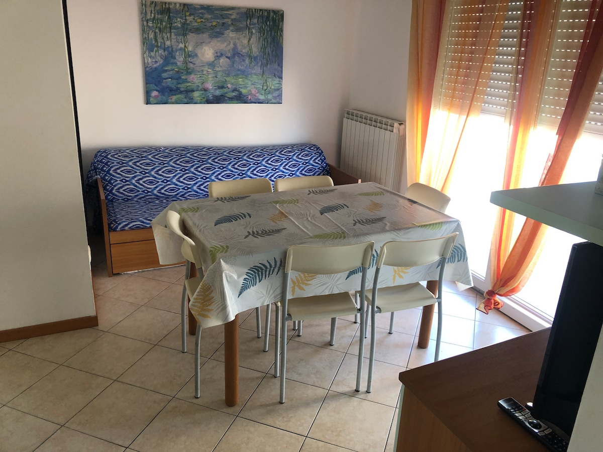 Grazioso appartamento al secondo piano con ascensore comodo per famiglie di 4 persone o 3 adulti - Spiaggia a 100 Mt, - parcheggio per 2 auto gratuito e coperto - Animali di piccola taglia sono i benvenuti - WiFi veloce - 1 letto matrimoniale queen size - 1 divano letto comodo per 2 bambini o 1 adulto - 1 lettino-culla - 1 seggiolone - Cucina completamente attrezzata - 2 ampi terrazzi per pranzare e rilassarsi - bar, pasticcerie, gelaterie, piadinerie, minimarket e sala giochi a 2 passi
