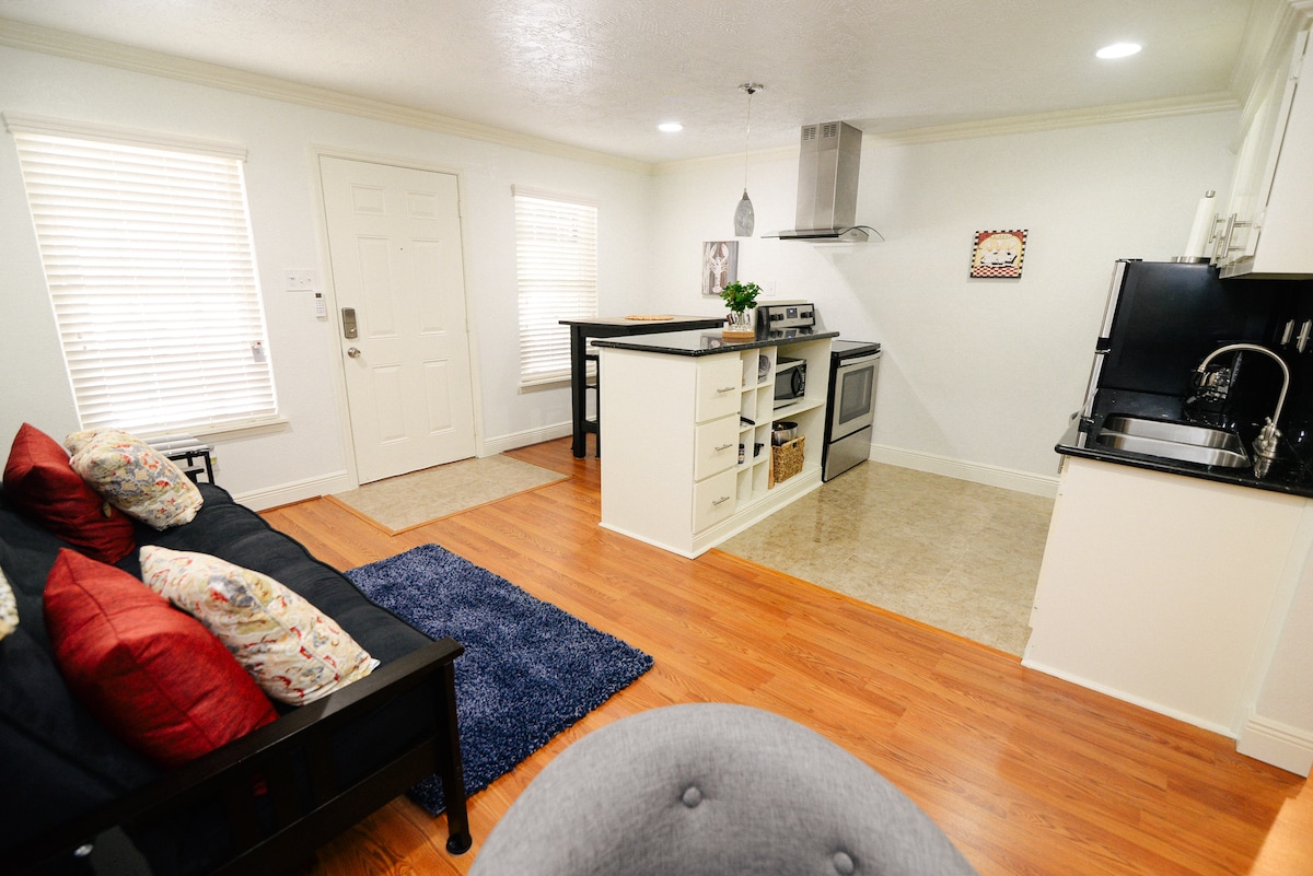 This newly renovated, ultra-chic garage apartment is centrally located in one of Houston's most up-and-coming neighborhoods, Montrose/Mid-town, which boasts a wide array of cafes, restaurants, shops, and bars all walking distance! With a lg. living room with a sleeper sofa and large smart TV, an open concept kitchen with bar seating and bistro table, with a nice separate large bedroom with luxury-grade king mattress / linens and a posh on-suite bathroom.