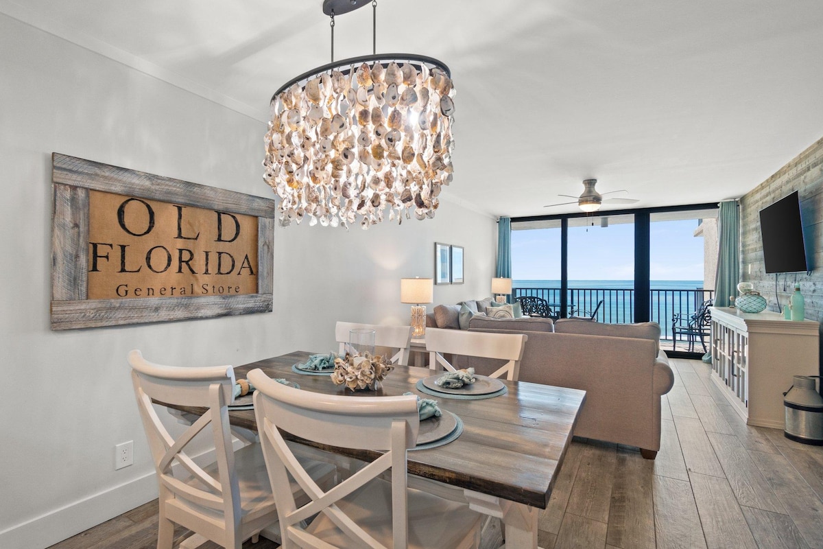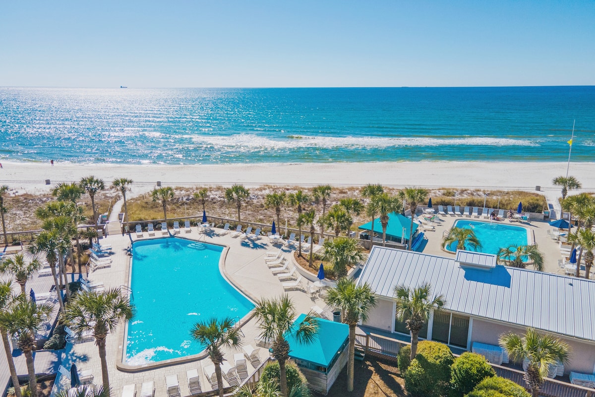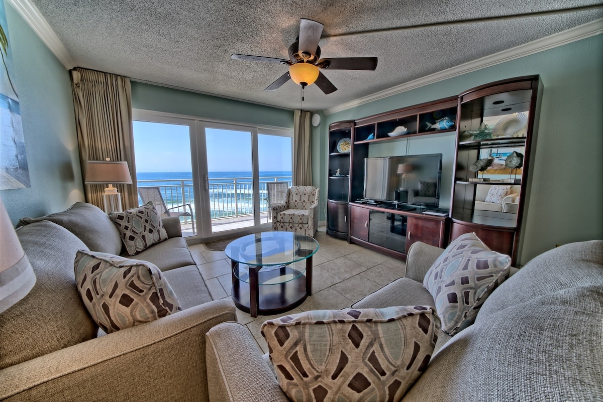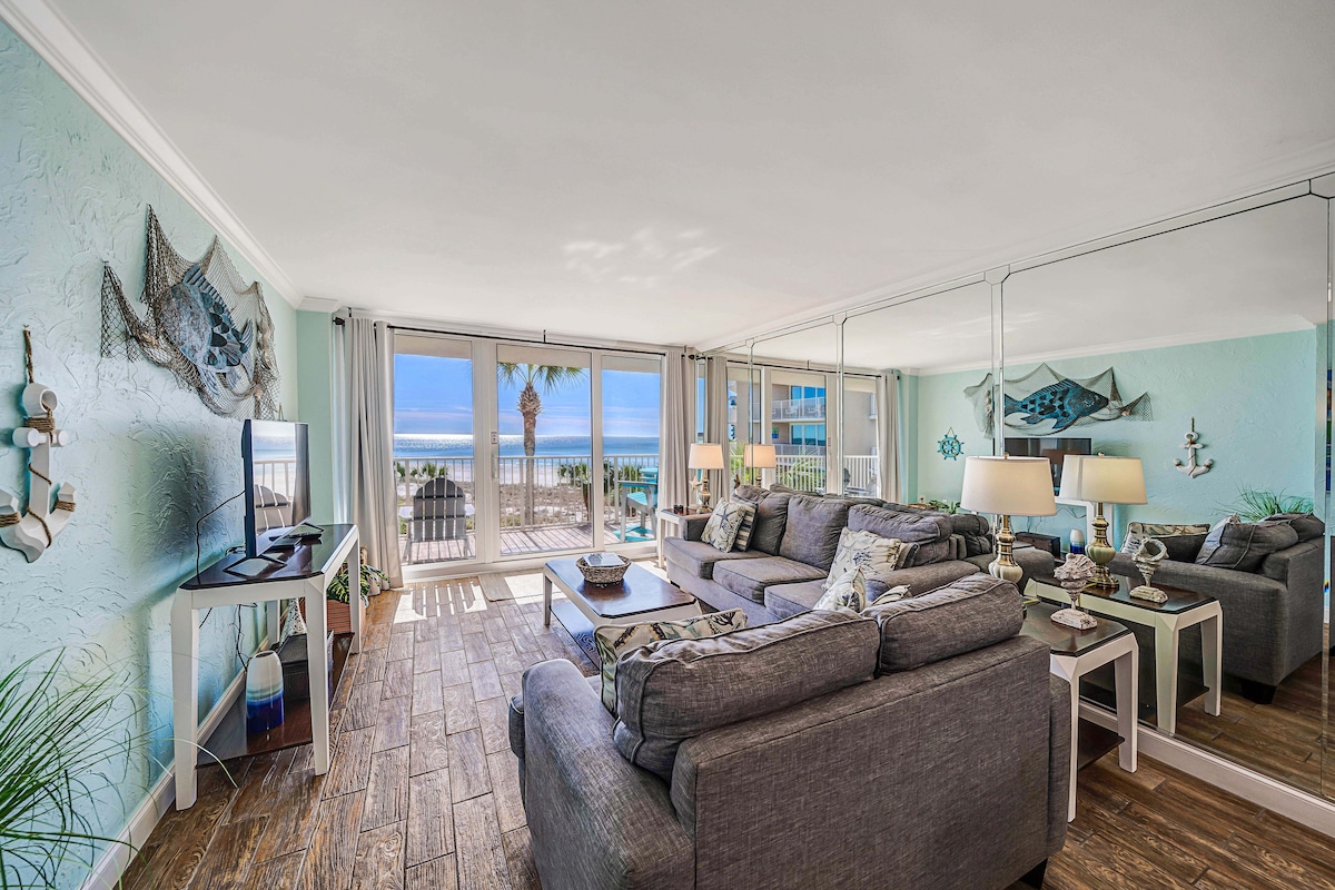 Boasting infinite Gulf views, an open floorplan, and elegant touches throughout, this deluxe, beachfront condo is guaranteed to please even the most discerning guests. The great room boasts a fantastic, full kitchen with stainless steel appliances and counter seating for three. Enjoy more formal meals together at the indoor table for six or al fresco on your furnished balcony. The cozy, sunlit living area includes a gas fireplace and a wall-mounted, flatscreen TV, while the sliding glass doors open the entire space up to the balcony. And for sleeping arrangements, this condo features three comfortable bedrooms including a "mermaid-friendly" kids' room. Guests will also enjoy access to a variety of on-site amenities including a fitness room, a seasonally-heated pool, and a hot tub.
