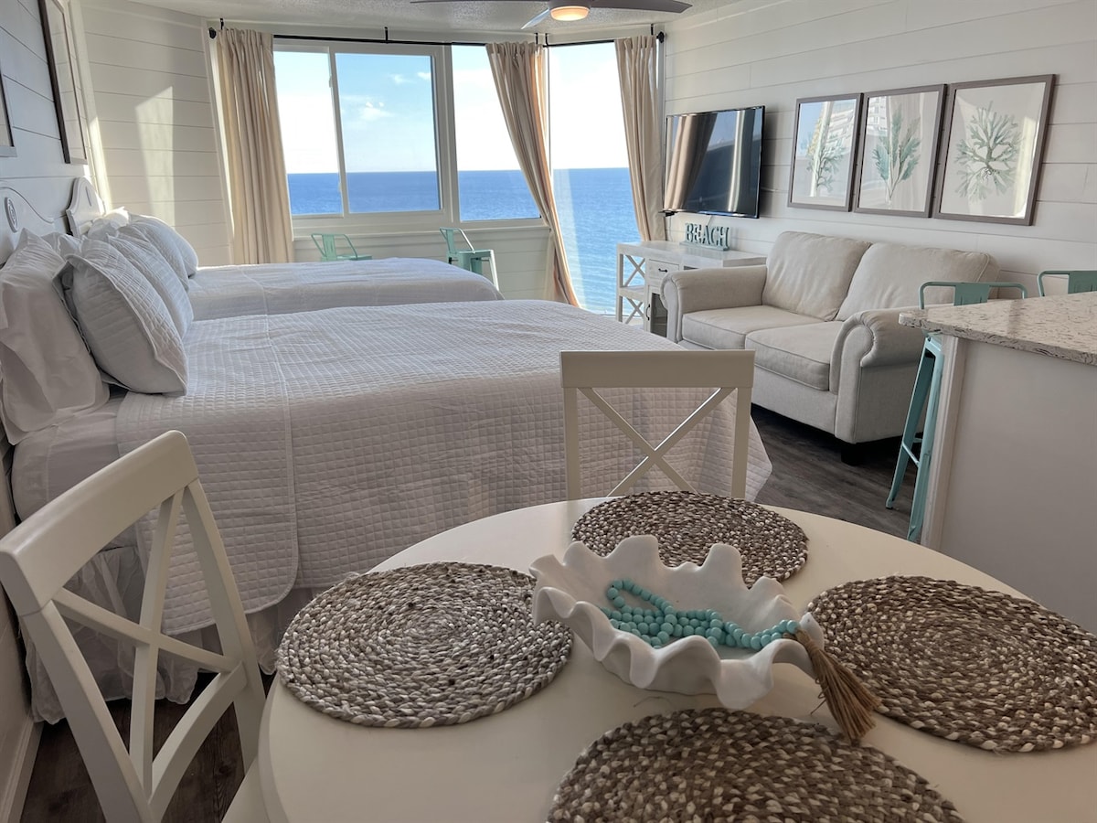 Welcome to your 11th floor balcony view of The World's Most Beautiful Beaches! Beachfront condo at Summit on Panama City Beach! *NEWLY RENOVATED AND DECORATED! Fresh, modern and fun decor! *Condo sleeps 5 with king in master suite, built-in bunks and leather sofa/ queen sleeper. 1 1/2 bath. *Washer & Dryer in the condo. *Linens/Bath towels, startup toiletries. *Smart HD TV, free Wi-Fi in living room & bedroom.