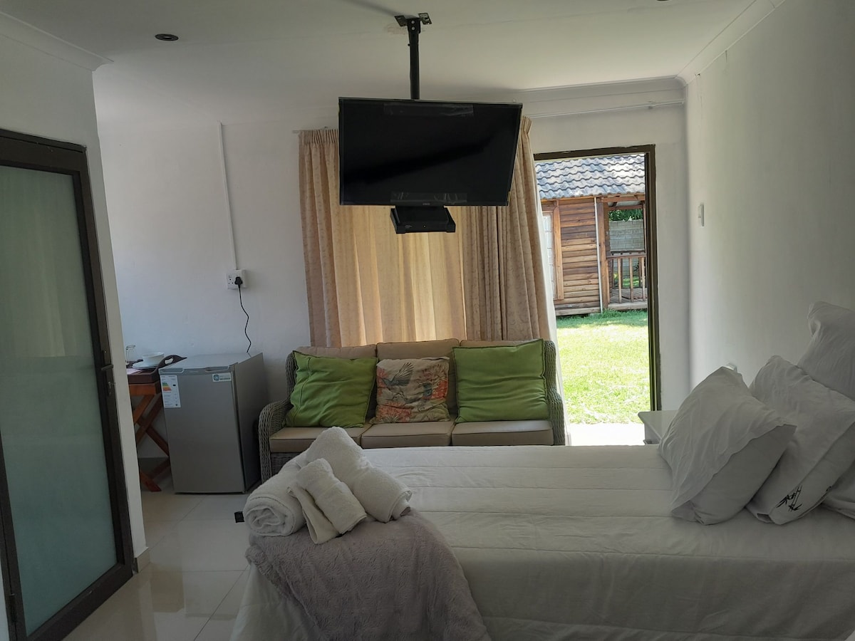 Welcome to our tranquil guesthouse in the heart of suburban Empangeni. Located in a large house with stunning architecture and beautiful garden. This Room has an en-suite bathroom with a shower and direct garden access and views. Equipped for the hot Zululand weather, there is an Air Conditioner. Guests have access to a Smart TV and high-speed Wi-Fi. Enjoy a swim in the pool or relax by the fireplace after a long day. (Please see other rooms listed on our host profile to find your ideal room).