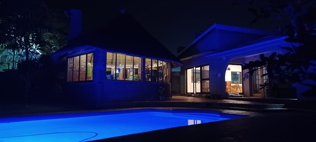 Pet freindly, private guesthouse in Richards Bay. A one-bedroom, self-catering unit with a queen-size bed and air con. En-suite bathroom with shower, toilet, basin, and walk-in closet incl small safe. Kitchen is fully equipped with a microwave, refrigerator, small stove, and two hot plates. In the living area, a double sleeper couch accommodates extra guests, and there’s free WiFi, Netflix, Prime Video, and YouTube for your entertainment. Private braai and lapa area with access to a pool
