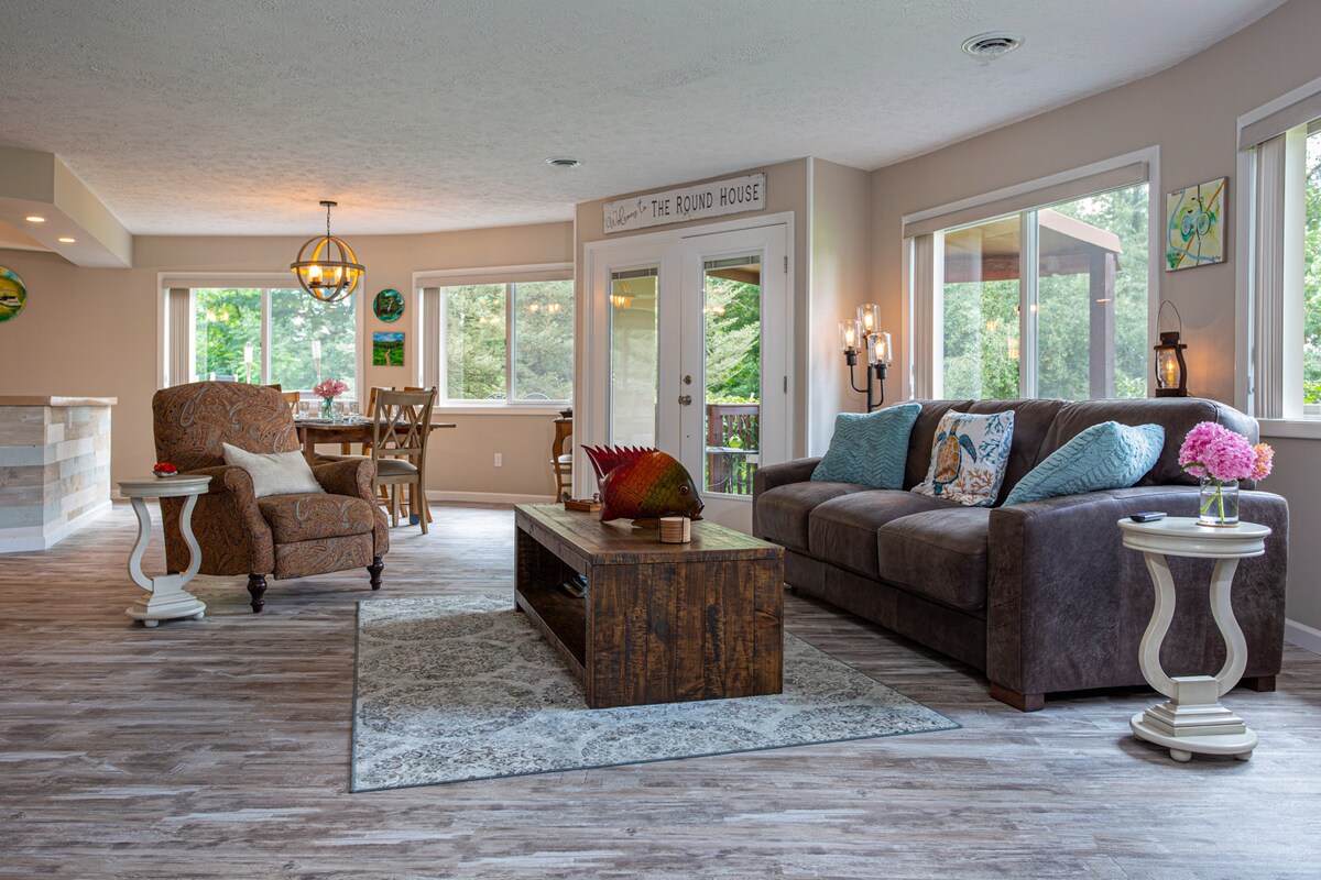 The open floor plan & wrap around outdoor deck lends itself for an awesome gathering place for family and friends. Sleeps 6-8 with three bedrooms offering queen beds and a bonus sofa sleeper in living area, 2 full bathrooms, well equipped kitchen. Beautiful views of the golf course & seasonal views of the lake. There is plenty available to do! Enjoy Pleasant Hill lake, hiking, kayaking, skiing or an evening with indoor games, outdoor fire pit at The Round House.