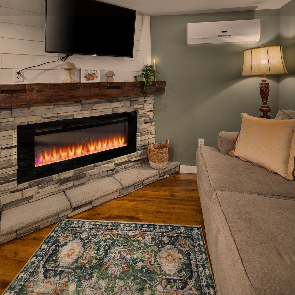 Elegance meets quiet living and plush comfort in this inviting modern office. Our Deluxe Office Guest House is the perfect overnight stay for on-the-go working singles or couples. Featuring a full kitchen, bath, washer & dryer, two work spaces, wi-fi, and TV with electric fireplace and queen size bed.