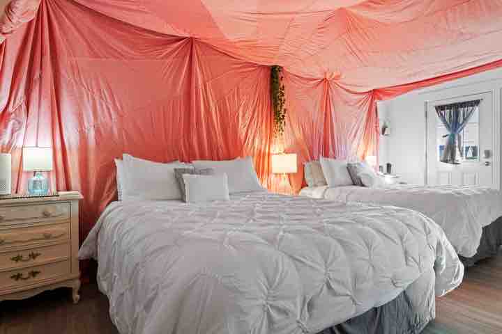 Escape to a chic 2-bed, 6-person studio, with a well-stocked kitchenette, dining area, s'mores kit, and cookies. Unwind on the comfy couch in the living room area with a Roku TV, or lounge in the indoor hammock chair. The Bali-inspired bathroom boasts a spacious stone shower for two. Outside, enjoy a fire pit, a mini golf course, and cornhole. Need a car? Inquire about our 2023 Tesla Model 3 rental.