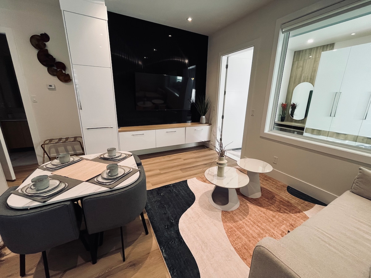 Business License: # 25034241… 654 Sq.ft of living space, combined with tasteful design. 100% your own private space and amenities, no one will be sharing with you. What you'll get: - 1 free parking space available - Full HD 4K Netflix - Own set of washer and dryer - high speed wifi - bath towels, shower gel, shampoo - all bedding, pillow, and sheets - office desk - Free bottle waters