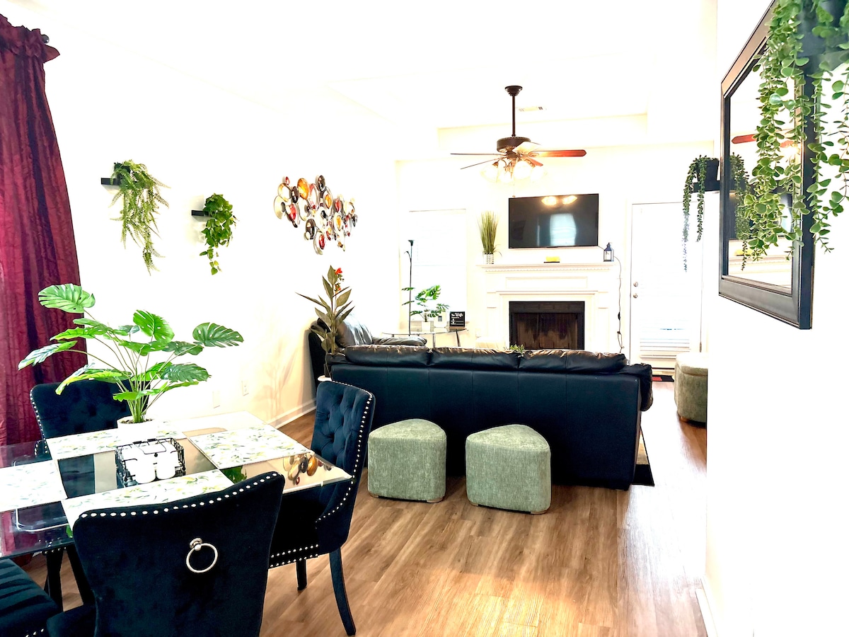 Three King Bedroom – Plush mattresses, blackout curtains, and plenty of space to stretch out Work-Friendly – Fast Wi-Fi SunsetViews – Relax on the deck and soak in the sunset over Grovetown Smart TVs – Stream your favorite shows in the living room or any bedrooms Fully Equipped Kitchen – Everything you need for cooking meals at home Cozy Living Room – fireplace, comfy seating, and southern charm