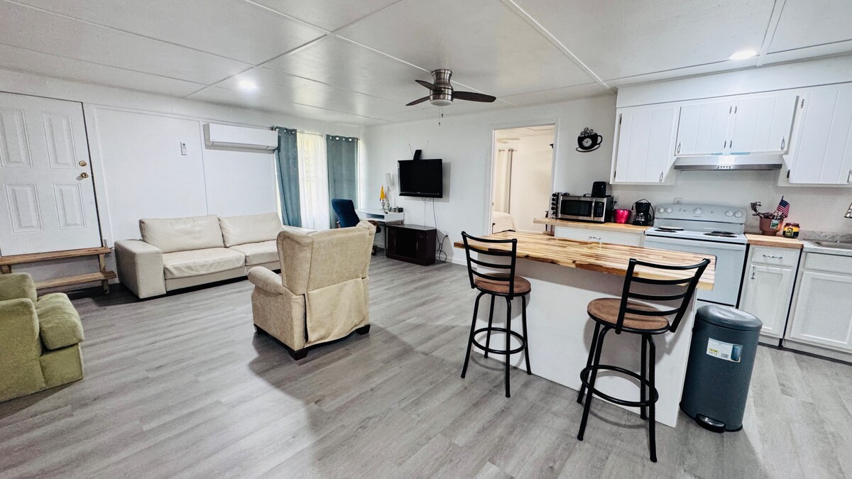 Enjoy a comfortable and peaceful stay in this bright and spacious private suite featuring a large bedroom, private bathroom, and access to an open-concept living and kitchen area. The bedroom includes a comfortable king-size bed with soft linens, nightstands with lamps, and plenty of space to relax. The open living space features a cozy seating area, smart TV, and a fully equipped with microwave, coffee maker, stove, refrigerator, and bar seating perfect for short or extended stays.