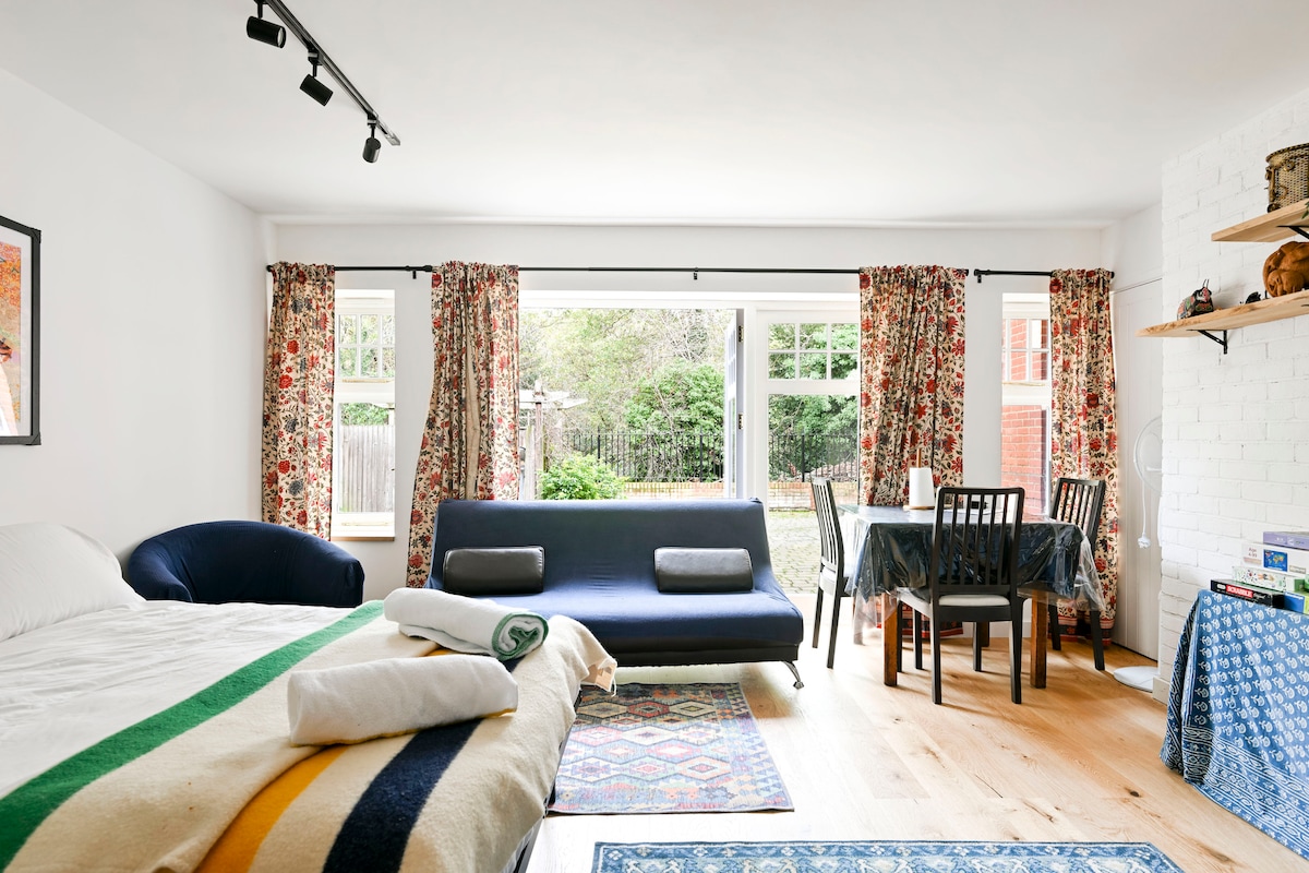 Spacious Studio ( ex photo studio) converted to a peaceful spacious self contained one bedroom studio apartment with high ceilings and access to our garden. Next to Richmond Park, Richmond on Thames, East Sheen, near Barnes and Putney, our own gate direct to the park! Two excellent pub/restaurants nearby, supermarkets 10 mins walk away. 25 mins by train to central London from Mortlake Station, about 15-20mins walk away, buses to Richmond are 6 mins walk away and take about 8 mins to town centre.