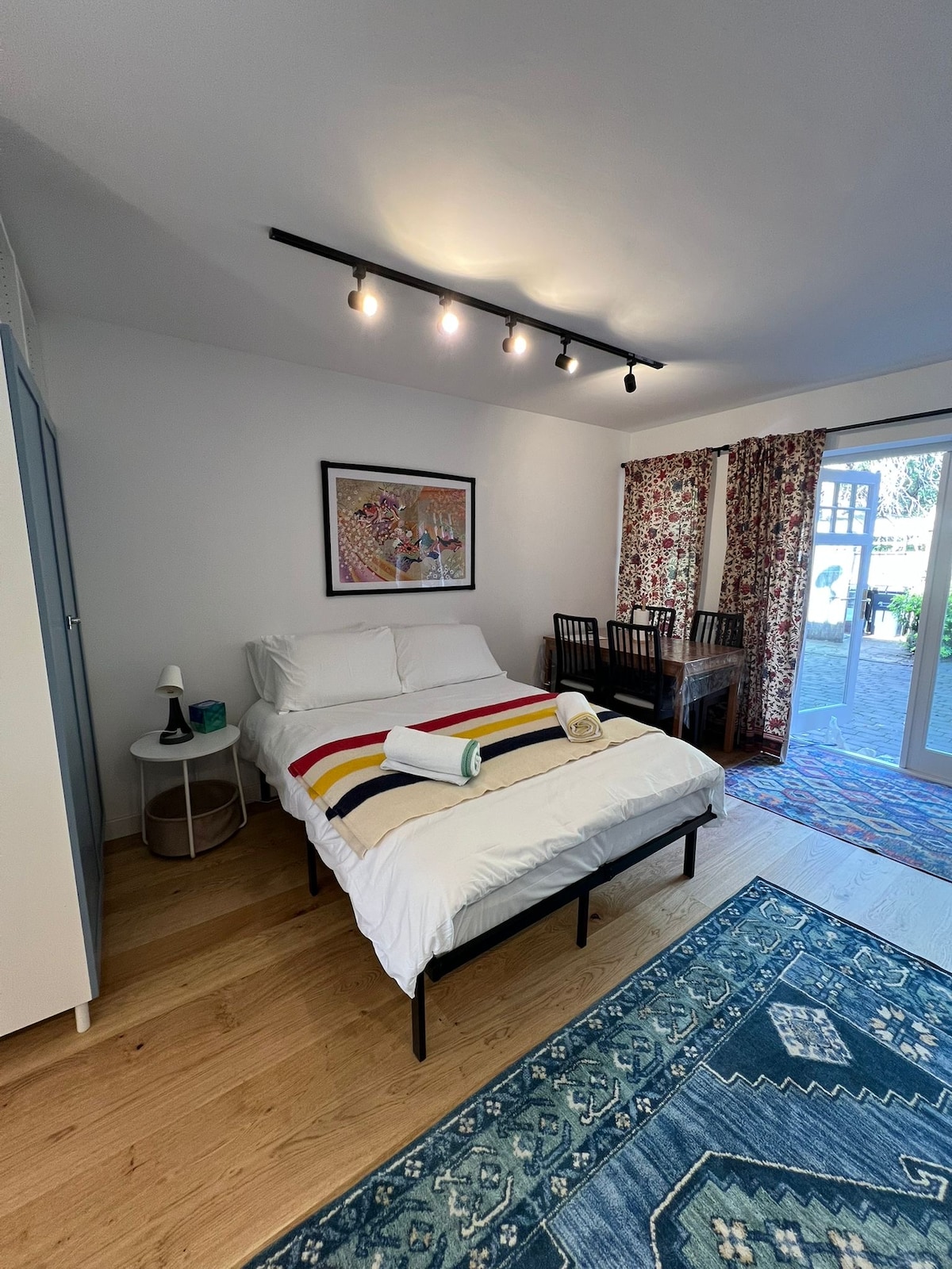A stylish, open plan and friendly space, in Sunbury-on-Thames. 5 minute walk to the River Thames and village. Large, modern, self-contained annexe, behind Sunbury House; own entrance and space for parking. Walking distance to the river, village centre with great pubs and restaurants. Hampton Court, Shepperton Studios and Kempton Park nearby. Easy access to Richmond, Windsor, Heathrow and M3/M25. Overground train to London Waterloo (50 mins). Garage facility to store bikes or canoe / kayak.