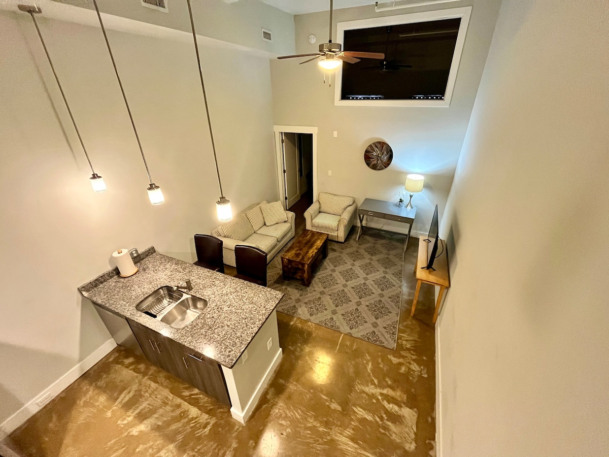 Primary guest must be 25 years old. We greet all guests in person upon arrival, you will be required to present a valid government ID to make a copy of for our records. Centrally located, newly renovated warehouse features 110 year old tin ceilings, heart pine floors, new amenities include granite counters, stainless appliances, central air/heat, ceramic tile baths, dishwasher, in-unit washer. Late check-in available, 6-10pm for $30 fee. Early check (if available) can be arranged for a $20 fee.