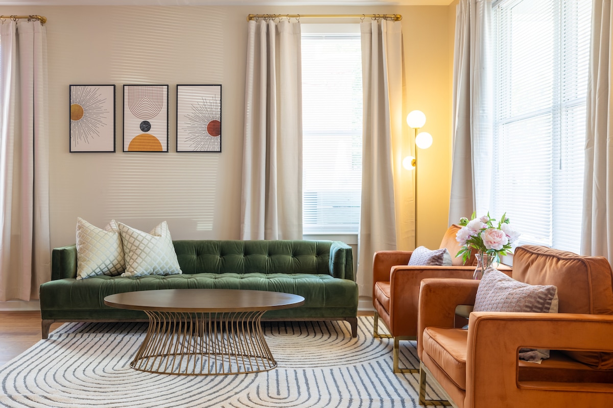 This stylish and spacious one bedroom one bath apartment is at the heart of the city, yet tucked quietly near the river. The room has a king bed with beautiful and sublet decor. It’s fun packed with a 75 inch television for an evening of relaxation in the cozy living room, fresh popping popcorn machine, a Nintendo Switch, and a fully stocked kitchen. It’s walking distance to restaurants and bars and minutes from VCU, James River, Carytown and most of Richmond.