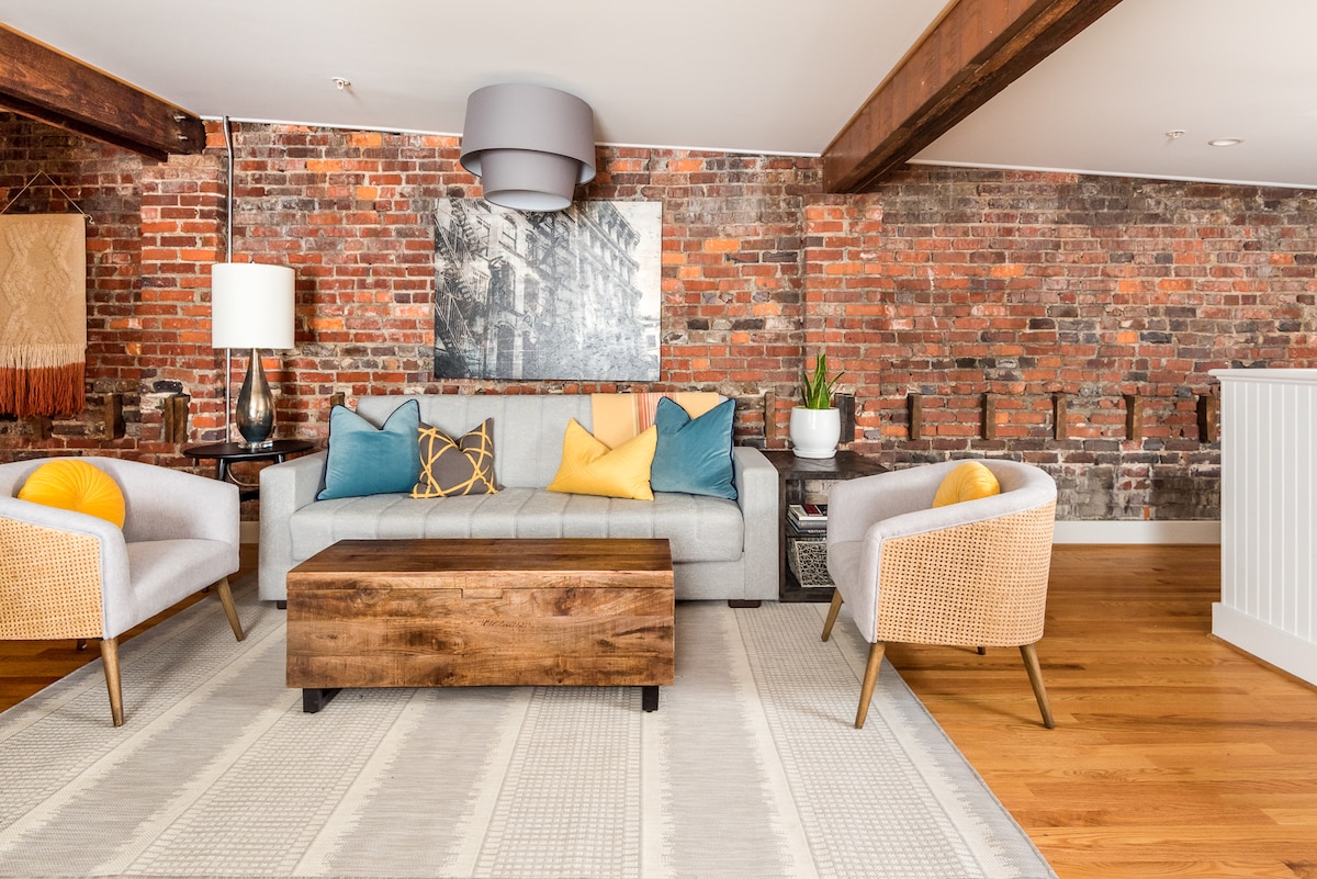 Experience designer charm in our 2BR/2BA 1 King bed and 1 Queen historic downtown apartment, designed by Lifestyle Expert Johnathan H. Miller. Modern comforts blend with historic charm, featuring skylights, a state-of-the-art kitchen, plush bedrooms, and spa-like bathrooms. Book for an unforgettable, elegant stay!