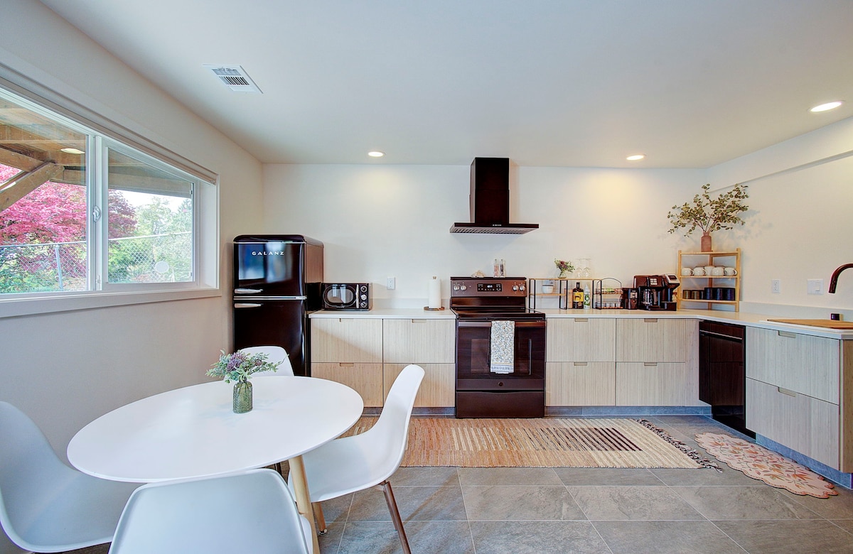 *Professionally cleaned* Modern, bright, clean and cozy one bedroom house! Complete with full kitchen. House located in a quiet neighborhood conveniently close to I-5. Perfect for business travel, couples cozying up, hikers exploring the surrounding beauty, a small family or friends kicking back and relaxing.