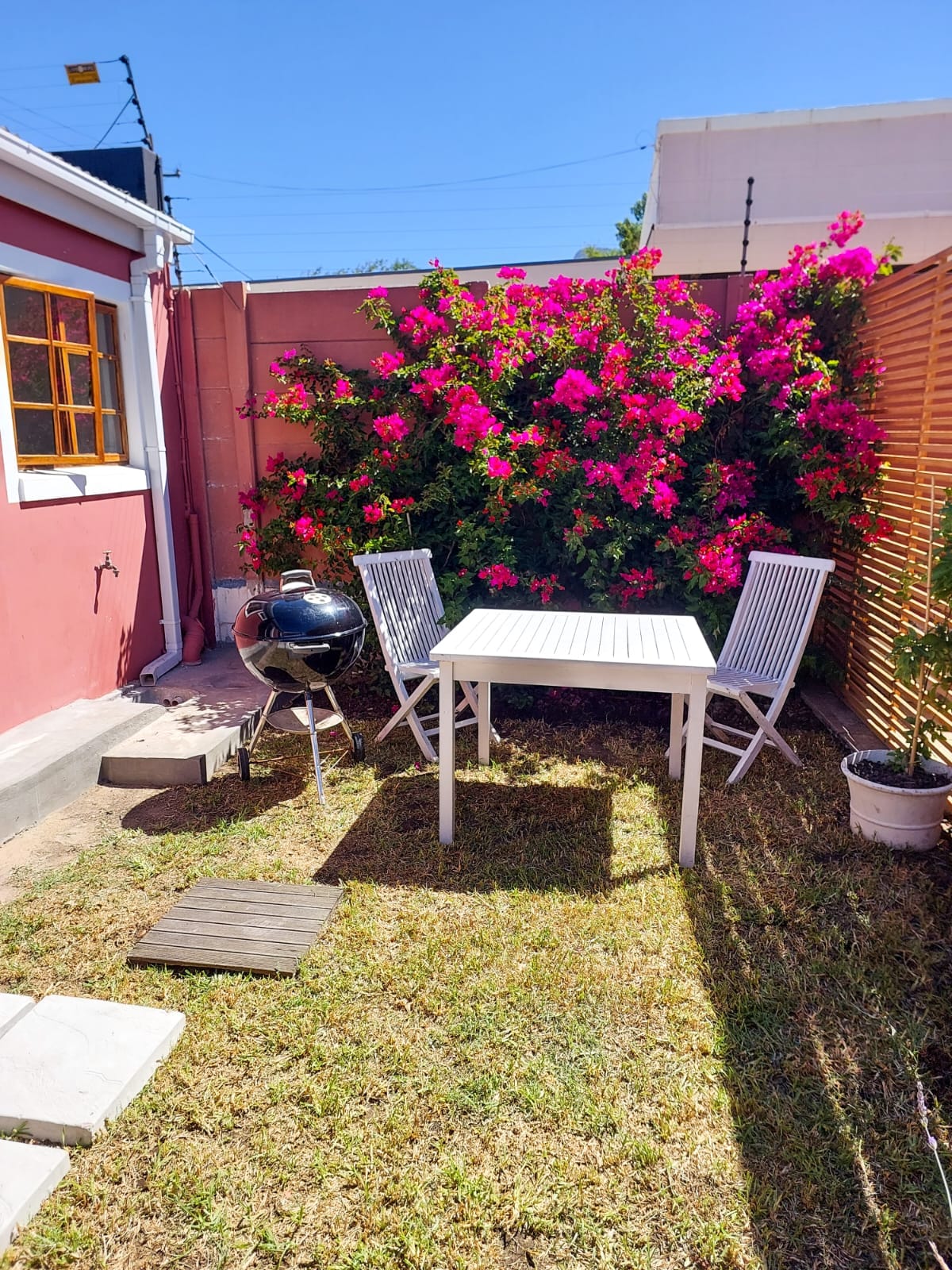 Pluck lemons from the tree and pick herbs from the planters for use in a tasty dish to enjoy in the cool and shaded courtyard. The bright and airy cottage interior has high vaulted ceilings, together with a selection of books and magazines to read to enjoy in the bed made up with 400TC luxury linen. Battery backed up Wi-Fi and additional lights for surviving load shedding. No smoking allowed on property. Guests have own cottage with a private, shady courtyard. Herbs in planters in courtyard and dart board are available for guests to use as well as lemons on own lemon tree. We're an international family consisting of a South African, a New Zealander and a Norwegian. One of us will always be available on our phones and we're happy to chat and share a G&T on our porch if our guests are up for it! This guesthouse is in a quiet neighbourhood, about 15 minutes by car from town and near to vibrant Harfield. Closer still, the village offers a farm stall, butchery, and supermarket within a short walk, plus coffee shops and lots of restaurants. We always recommend uber for short term stays in Cape Town but there is an off-street sheltered parking available if needs be. 10 minute walk to Kenilworth train station and 2 minute walk from Main Road with frequent taxi buses in both directions. Servicing of cottage and laundry can be done on request. Continental breakfast can be provided on request.
