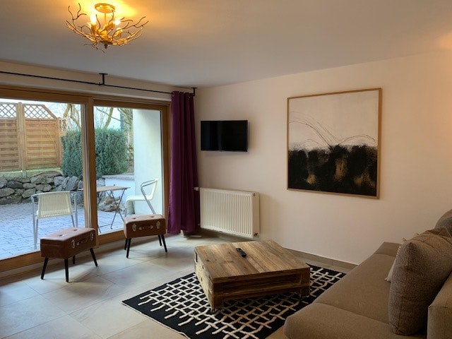 Beautifully restored home "Die Alpe" in Garmisch. We call this apartment Gams or mountain goat. The Gams has natural stone and oak wood floors, a kitchen with cozy seating area, living room, bedroom, second open loft bedroom and modern bathroom. Explore the loving details to be found throughout the apartment. Our goal is that you look forward to returning "home" at the end of a full day of sports or sightseeing. You can walk to shops/restaurants/bars in 5 min. Enjoy and relax during your stay!