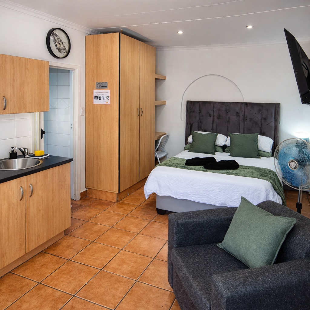 Escape to Wishbone Studio – a luxurious guest suite, offering serene comfort, in the upmarket residential neighborhood of Lynnwood. Perfect for business trips, hospital/medical visits, academic stays, school/sporting events, theatre outings, or visiting friends and family in Pretoria East. Fast reliable Wi-Fi supports seamless remote work. Enjoy the peaceful private outdoor area for quiet downtime, plus free parking in this prime security estate. Your convenient short-term home away from home.
