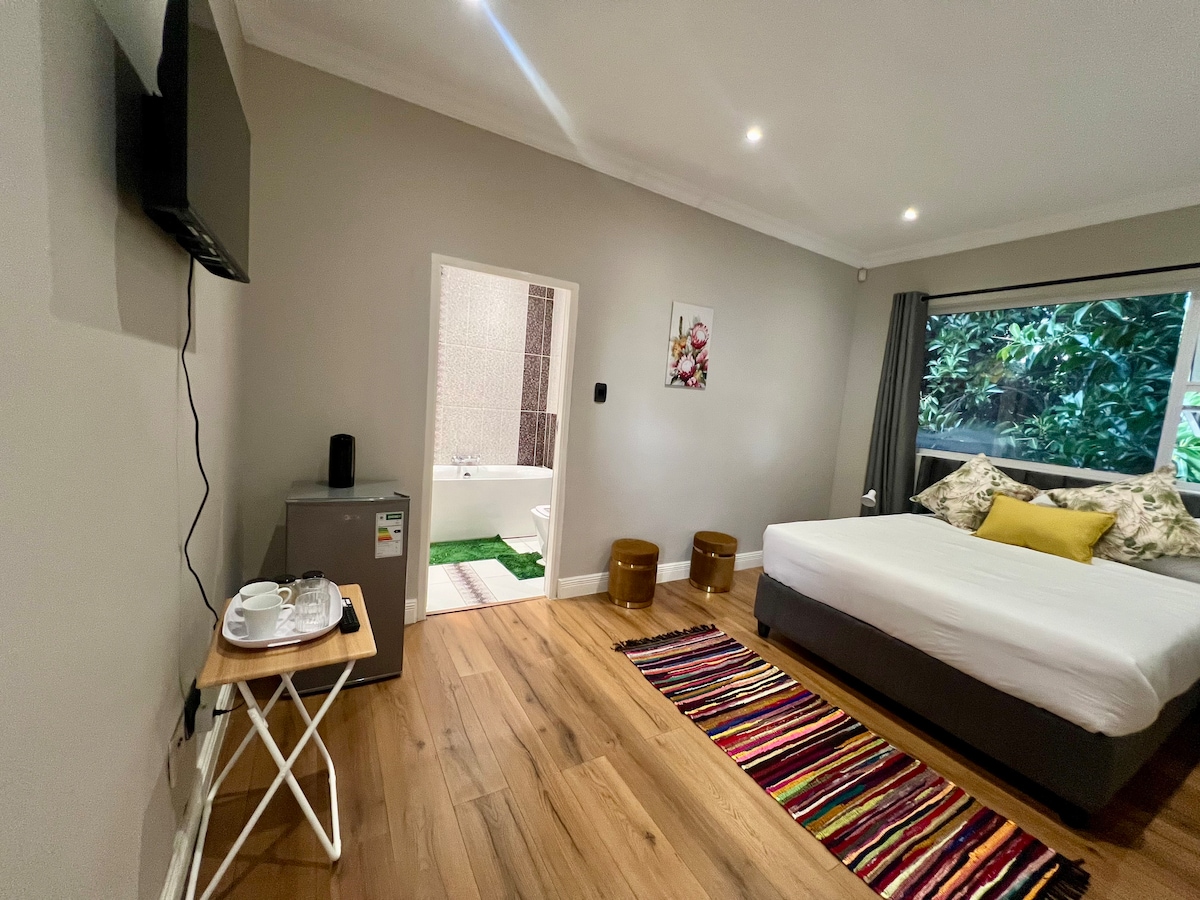 This peaceful, secure guesthouse features two bedrooms (queen and twin/king option), a fully equipped kitchen, and a spacious living area with dining table and lounge. Enjoy entertainment with DSTV, Netflix, and free Wi-Fi. A desk is available for work, while a gas heater ensures warmth on cooler nights. Relax on the deck, by the fire pit, or under the acacia tree for a braai. Free secure parking, child-friendly, 5 mins from Wilgers Hospital and a shopping center.
