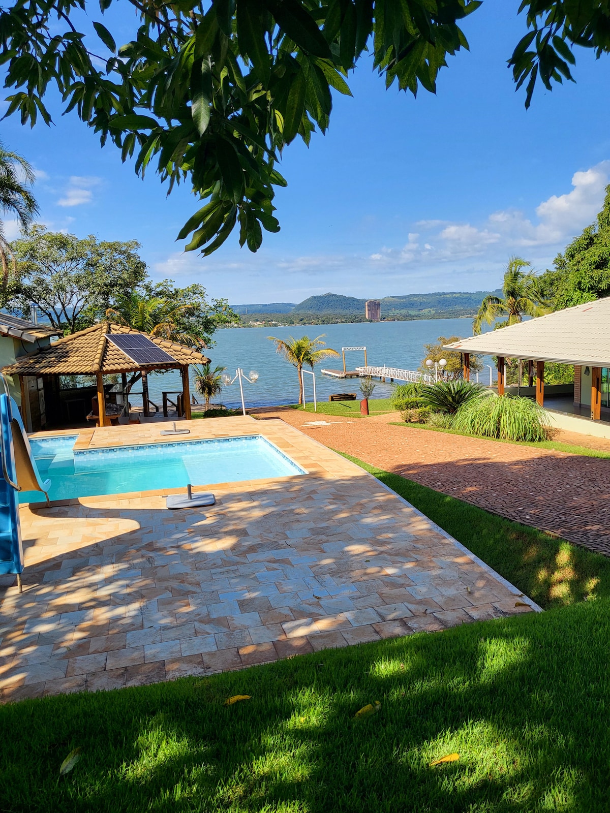 Relaxe com toda a família nesta acomodação tranquila. Casa nova em condomínio fechado . De frente para a represa de Jaguara. A 4 Km do centro de Rifaina . Total segurança! Piscina , quadra de Beach Tênis , Pier para atracação de barco . Casa com 3 dormitórios, sendo uma suíte com cama de casal. Um quarto com uma cama de casal e uma de solteiro e o terceiro quarto com 2 camas de solteiro. Todos os quartos com ar condicionado. Lavabo no térreo e churrasqueira. Terraço com vista para a represa .