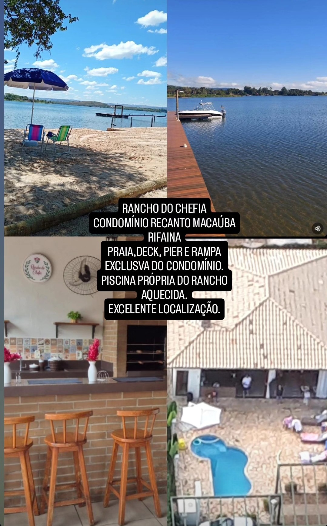Rancho condomínio em Rifaina, acomoda 12 pessoas , 3 Suites com ar cond, 2 camas de casais, 1 cama King, 2 beliches, 2 camas de solteiro, 1 sofá cama, quiosque com churrasqueira, mesa de sinuca, cozinha (dois fogões, freezer e geladeira) , WiFI, piscina, a 1,2 km do supermercado de Rifaina localização privilegiada, área comum com deck para lanchas, não disponibiliza roupas de cama, aluguel mediante a contrato pré estabelecido