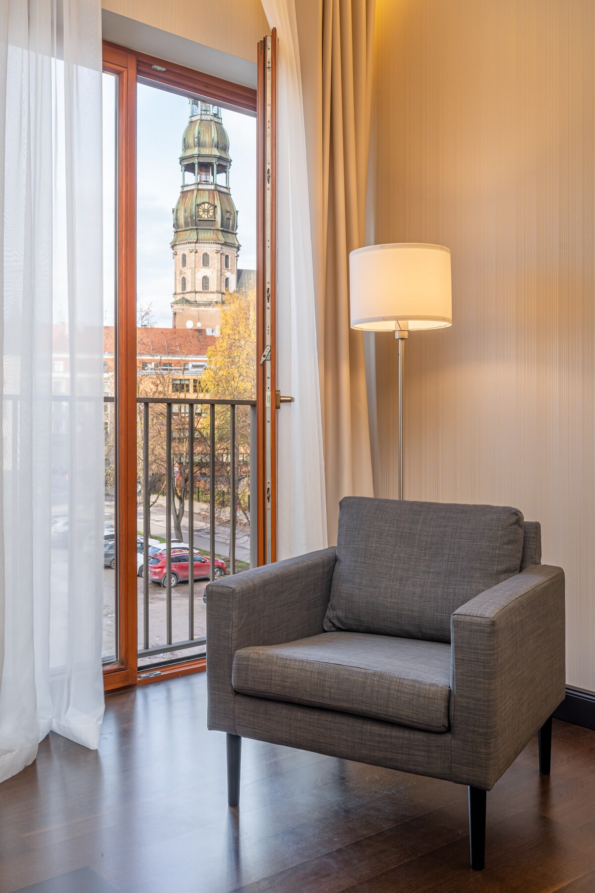 A quiet and secure 5th floor apartment in the heart of Old Town Riga with direct views of St. Peter’s Church and St. John’s Church. Three large windows frame iconic church towers and historic rooftops, offering one of the most recognizable views in Riga. Despite the central location, the apartment is quiet and peaceful - ideal for couples seeking comfort, privacy, and a romantic stay within walking distance of all major attractions. Elevator by KONE is available (rare in Old Town buildings).