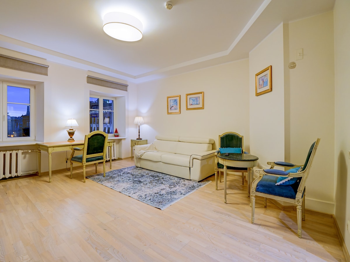 Spacious studio in a legendary historic building, next to the City Hall and the House of Blackheads. Super convenient for getting to and from Airport or International Coach Terminal. It's a quiet residential area, where windows are oriented toward stunning view of St. Peter's cathedral and beautifully old oaks, shining in the morning sun and acquiring a fresh air from the green and quiet square. Downstairs is a Latvian cuisine and free parking (ask for permit)