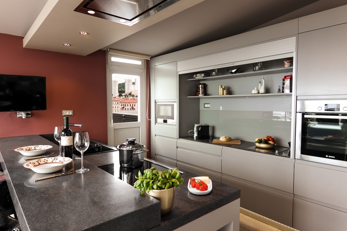 This modern apartment is located in Rijeka, near to the Tower Shopping Center, 200 meters from the first beach, 5 minutes drive to the beach in Kostrena, 15 minutes walk to the City center and 2 km to the Trsat Castle. You will need to do few stairs more to Apartment m, it is at the 4th floor, but I promise it is worth because of the view :) Inside you will have electric tent, air-conditioning, satellite television, free WI-FI, alarm. Safe and public (free) parking is in front of the building.