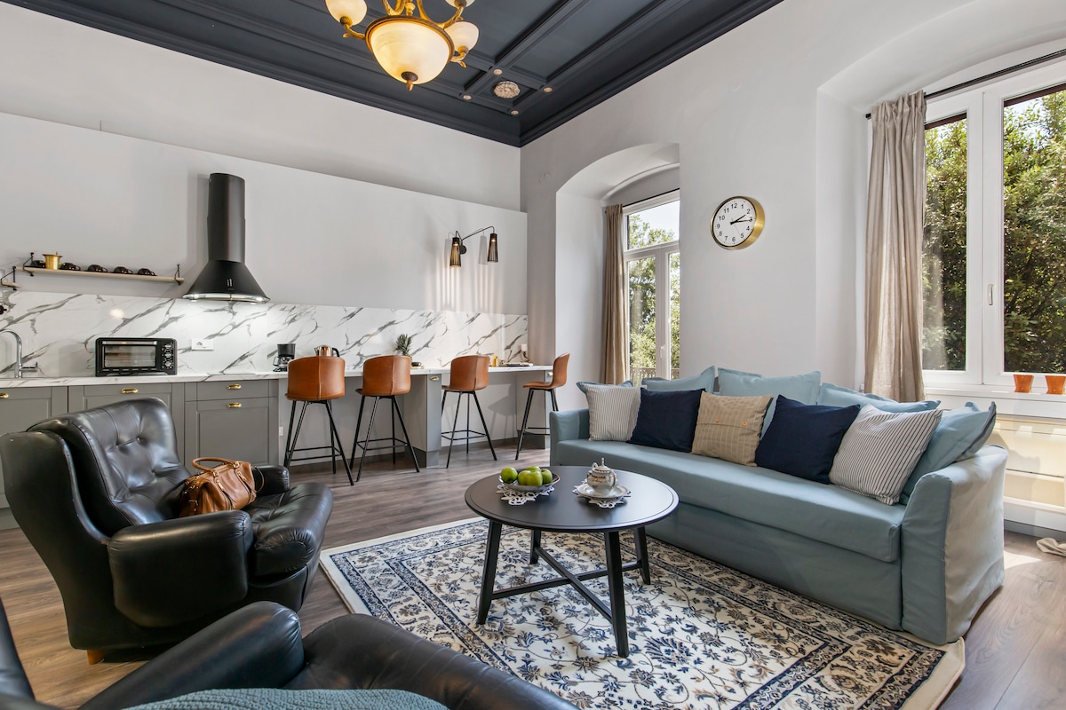 The apartment is situated close Opatija city center, only a few minutes away by car or an eight minutes walk. It consists of a living room, bedroom, a dining room, two bathrooms, kitchen, sauna, open space lounge, terrace, a surrounding garden and a car parking. Thanks to the fact of being in the ground floor with a surrounding garden you have the sensation of renting a house and not an apartment.