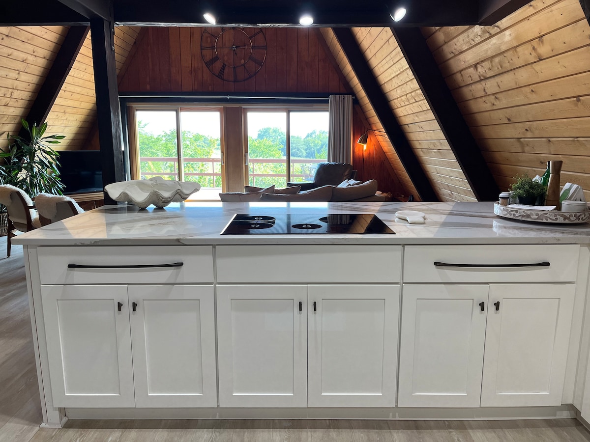 Welcome to the Little Apple A-Frame – the perfect place for you to unwind & unplug in a unique and tranquil cabin! Cozy up beside the warming electric fireplace or enjoy time outside with our outdoor activities. Whether seeking a romantic getaway or quality family time you will experience it here! Set in nature w/views of Tuttle Creek Lake: ✲ Private Hot Tub! ✲ Fire pit on large upper deck! ✲ Abundant hiking! ✲ Disc golf course! ✲ Community dock access! ✲ 30 mins to Downtown & KSU!