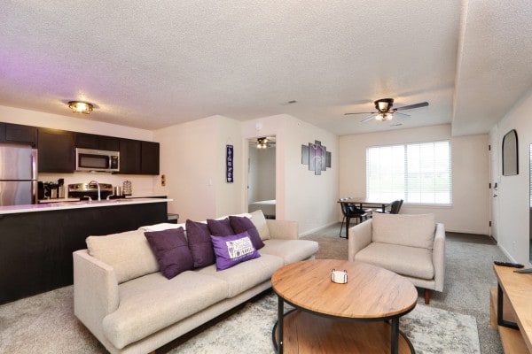 All the way to the cork screw and blender, this unit has it all. 1 1/2 miles to KSU Football Stadium, this unit is available for anything from nightly to yearly lease. A nice mix of modern and traditional furniture with a wide inventory of necessities and luxury linens for your comfort. Built by innovators in construction in Manhattan, the structure has concrete and insulation in the floor that yield a quietness that's unsurpassed. NEW - Pickleball/Tennis/Basketball Court and 1g Fiber Wifi!!