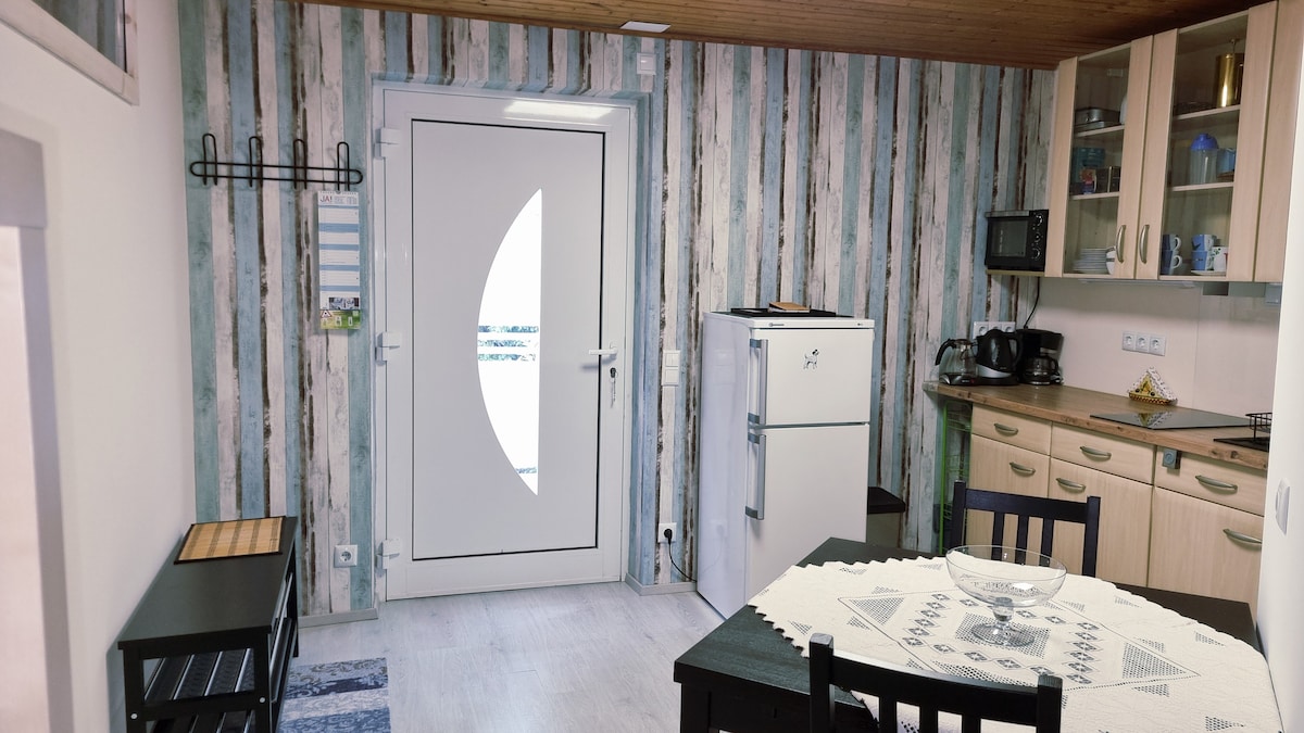 Gerne Begrüßen wir Sie in unerem kleinen, gemütlichen 35qm Appartment. Es bietet Platz für drei Personen. 2019 haben wir die Wohnung komplett saniert und neu Eingerichtet. Es erwatet Sie eine nahezu voll ausgestattete Küche mit Essbereich und TV, eine offene Schlafnische mit Doppel- und Einzelbett und ein Bad mit Badewanne. Über die Eingangstür haben Sie direkten Zugang zur großen Terasse. Waschmaschine und Trockner können, gegen Gebühr auf Anfrage, in einem Separtem Waschkeller genutzt werden.