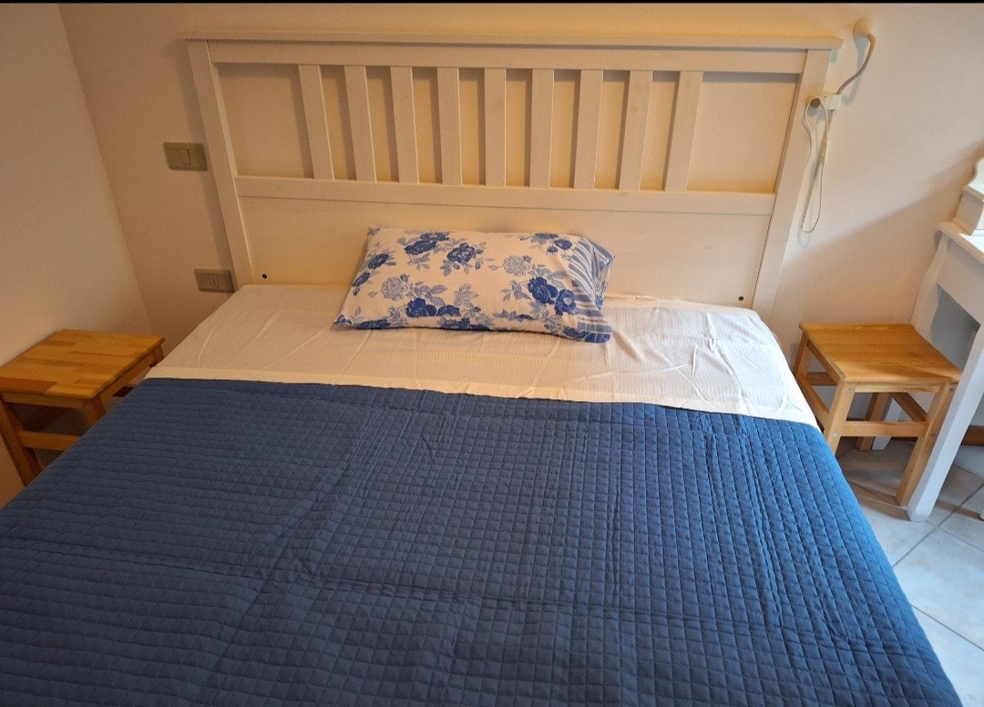 Stanza mansardata, ampia e tranquilla con bagno privato. Non è indipendente, si accede dall'ingresso posteriore di casa mia. Dispone di letto matrimoniale, letto a una piazza e 1/2, aria condizionata, tavolo, frigorifero, microonde, bollitore. Non ha cucina e non ha balcone. Fornisco io : lenzuola, asciugamani, shampoo e prodotti per la prima colazione. La cucina non è disponibile. È richiesto all'arrivo un contributo pulizie da 10,00 euro a 30,00 euro in base alla durata del soggiorno.